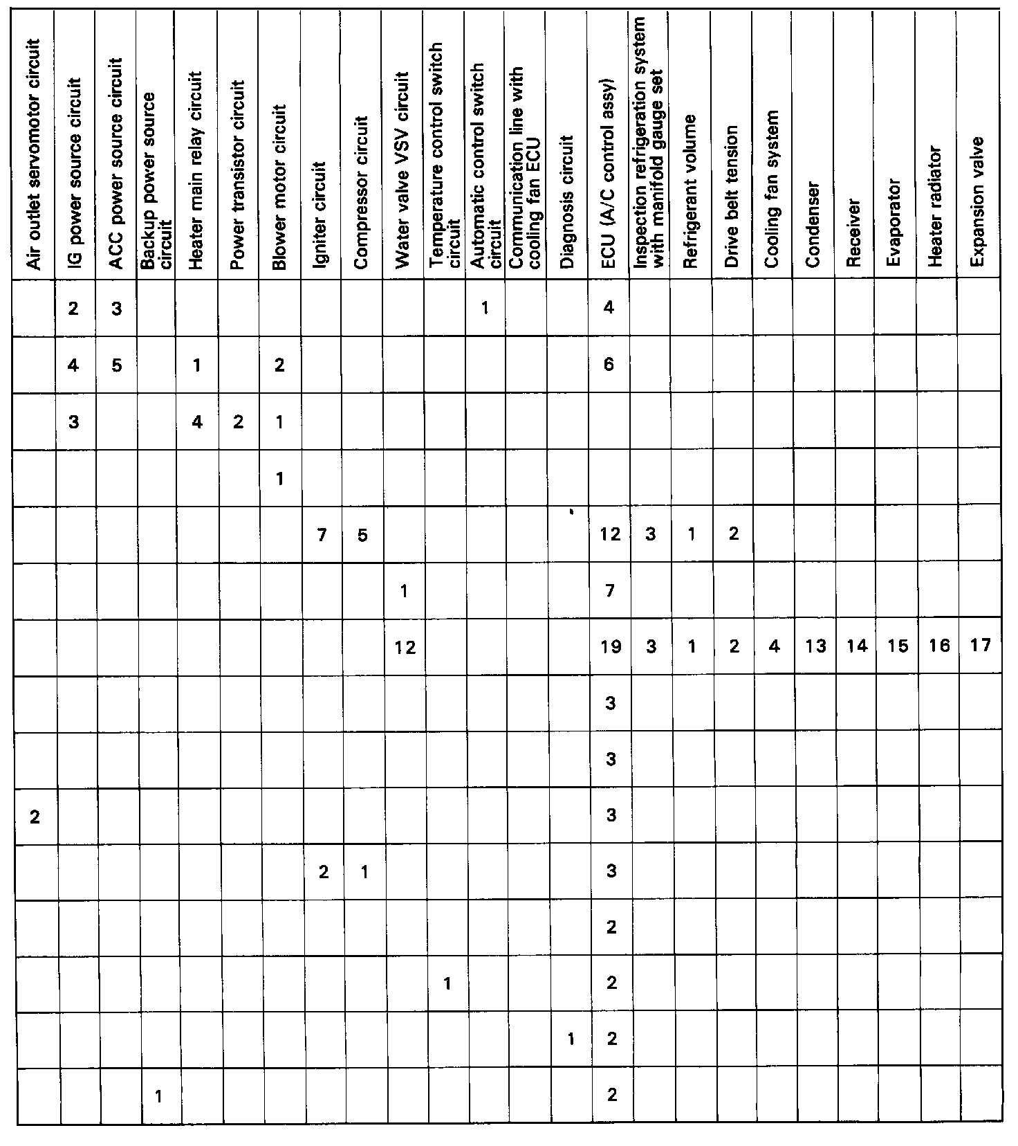 MATRIX CHART OF PROBLEM SYMPTOMSIf a normal code is displayed during the diagnostic trouble code check (sensor check) but the trouble still occurs (reappears), perform out troubleshooting for each problem symptom, checking the circuits for each symptom in the order given.