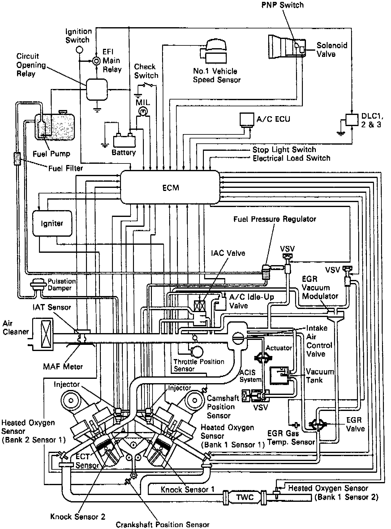 The Toyota Computer Controlled System (TCCS) consists of sensors which detect various engine conditions and an ECM which controls the fuel injection timing, the self diagnostic function, the ignition timing control, the idle speed control, the fuel pressure control and the fuel pump control.