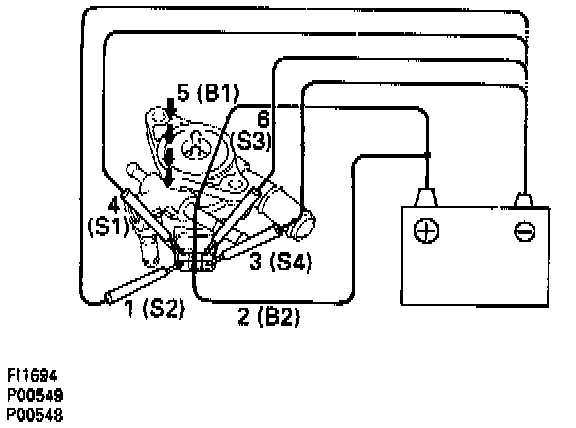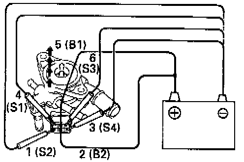 - Connect the battery positive lead to terminals 5 (B1) and 2 (B2), and the negative lead to terminals 4(S1) - 1(S2) - 6(S3) - 3(S4) in that order. The valve moves in the closing direction.