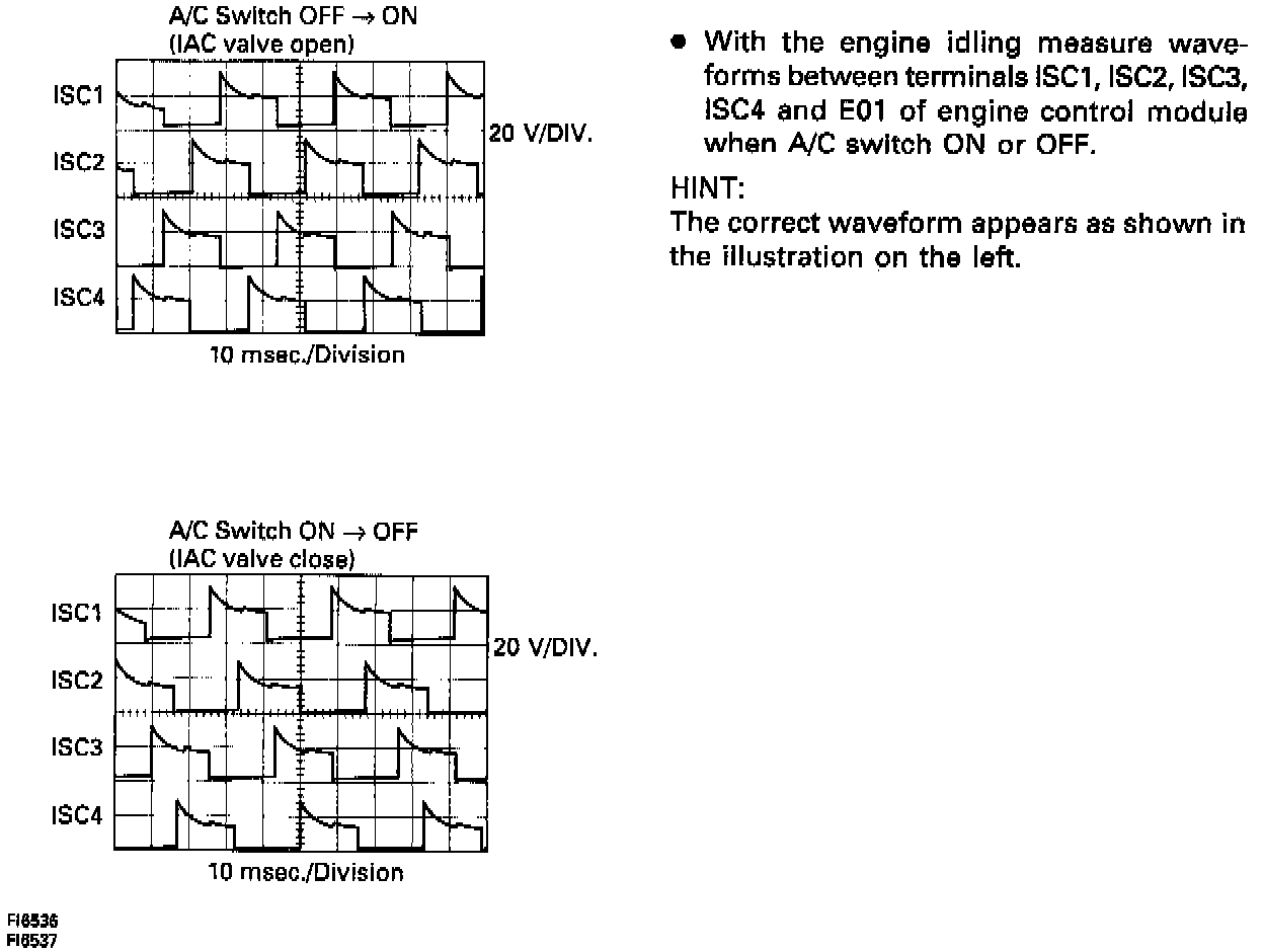 With the engine idling measure between terminals ISC1, ISC2, ISC3, ISC4 and E01 of