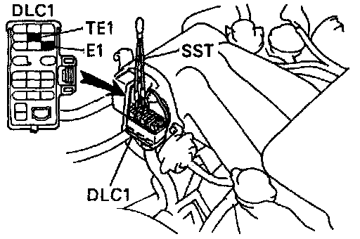 - Using SST (SST 09843-18020) connect terminals TE1 and E1 of the DLC1. check that idle-up occurs for approx. 3 seconds.