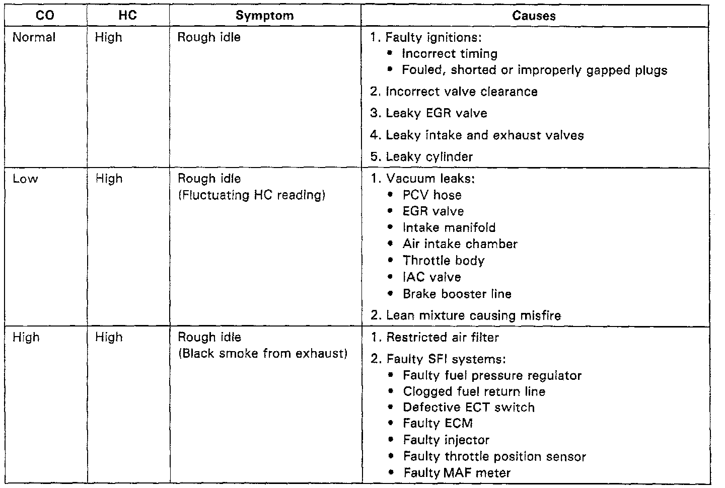 If the CO/HC concentration does not comply with regulations, troubleshoot in the order given in the chart. Inspect the possible causes, and then correct the applicable causes as necessary.