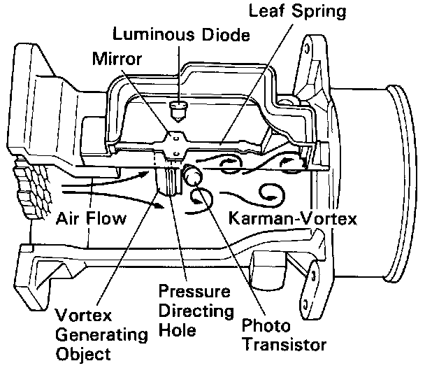 As shown in the figure, when a pillar (Vortex generating body) is placed in the path of a uniform flow, vortices called Karman-Vortex are generated downstream of the object. Using this principle, a vortex generator is placed inside the volume air flow meter. By measuring the frequency of the vortices generated, the Engine Control Module (ECM) can determine the volume of air flowing through the volume air flow meter. The vortices are detected by their exerting pressure on thin metal foil (mirror) surfaces and a light emitting element and light receptor (LED and photo transistor) positioned opposite the mirror which optically senses the vibrations in the mirror. The ECM uses these signals mainly for calculation of the basic injection volume and the basic ignition advance angle.