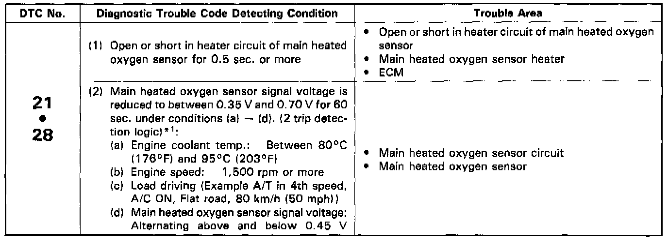 HINT: Diagnostic trouble code "21" is for the main heated oxygen sensor (Fr) circuit. Diagnostic trouble code "28" is for the main heated oxygen sensor (Rr) circuit.