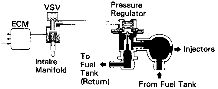 The Engine Control Module (ECM) turns on a Vacuum Switching Valve (VSV) to draw air into the diaphragm chamber of the pressure regulator if it detects that the temperature of the engine coolant is too high during engine starting.