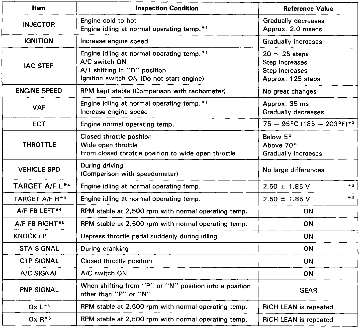 *2: If the engine coolant temp. sensor circuit is open or shorted, the ECM assumes an engine coolant temp. value of 80°C (176°F).