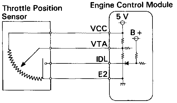 The throttle position sensor is mounted in the throttle body and detects the throttle valve opening position. When the throttle valve is fully closed, the IDL contacts in the throttle position sensor are on, so the voltage at the terminal IDL of the Engine Control Module (ECM) becomes 0 V. At this time, a voltage of approximately 0.7 V is applied to the terminal VTA of the ECM. When the throttle valve is opened, the IDL contacts go off and thus the power source voltage of approximately 12 V in the ECM is applied to the terminal IDL of the ECM. The voltage applied to the terminal VTA of the ECM increases in proportion to the opening angle of the throttle valve and becomes approximately 3.2 - 4.9 V when the throttle valve is fully opened. The ECM judges the vehicle driving conditions from these signals input from the terminals VTA and IDL, and uses them as one of the conditions for deciding the air-fuel ratio correction, power increase correction and fuel-cut control etc. The sub-throttle position sensor is built and operates in the same way as the main throttle position sensor. This sensor is used for traction control. The sub-throttle valve is opened and closed by the sub-throttle actuator according to signals from the TRAC ECU to control the engine output.