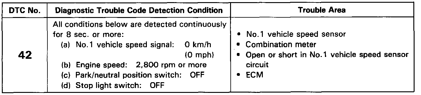 In test mode, diagnostic trouble code 42 is output when vehicle speed is 5 km/h (3 mph) or below.