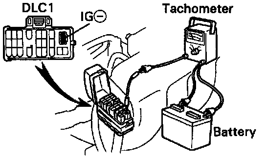 1. With a tachometer connected to the system, connect the tester probe of the tachometer to terminal IG- of the DLC1.