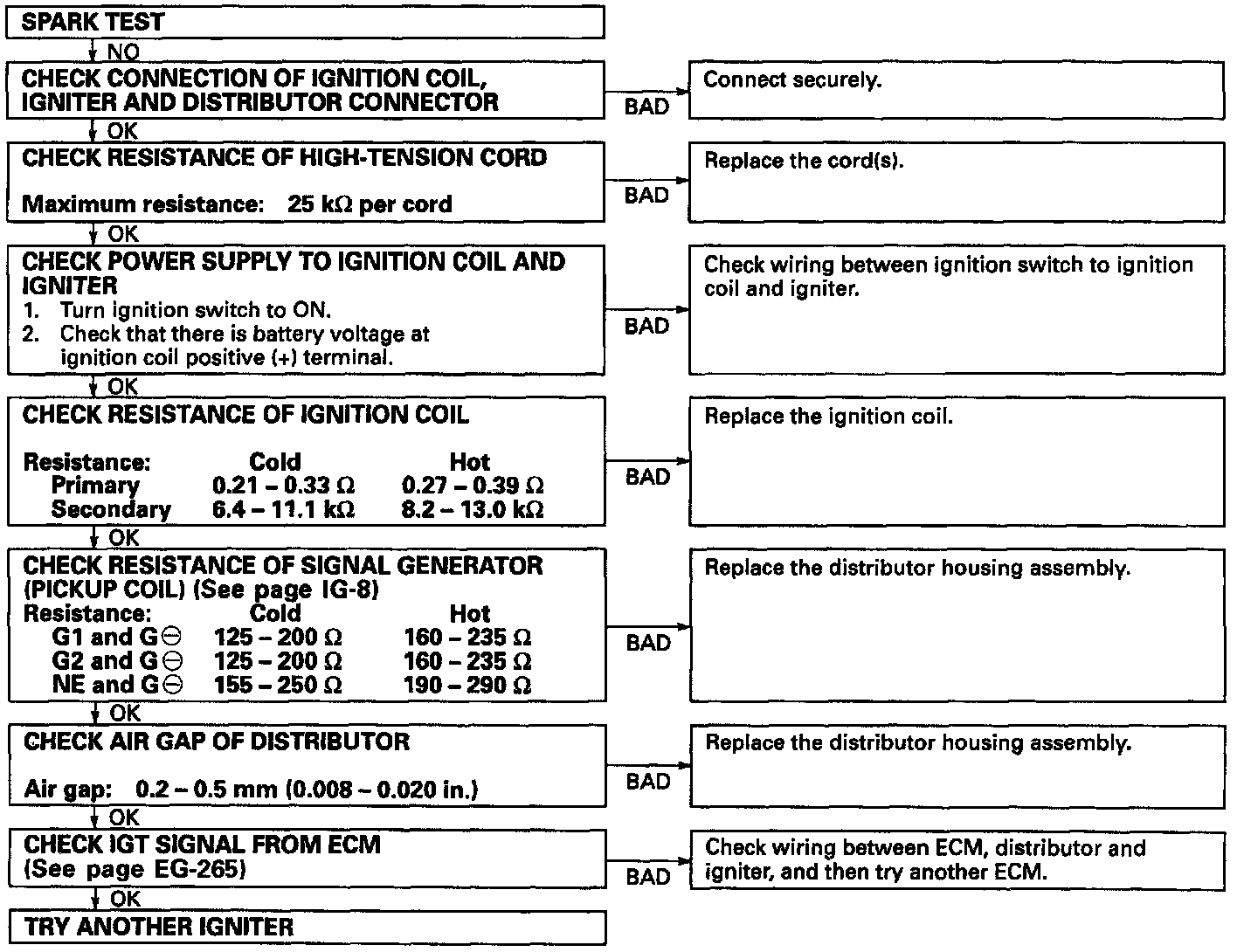 CHECK THAT SPARK OCCURS- Disconnect the high-tension cord (from the ignition coil) from the distributor cap.