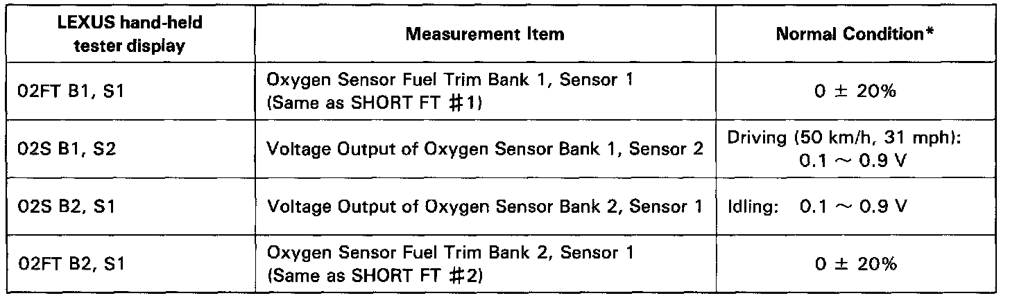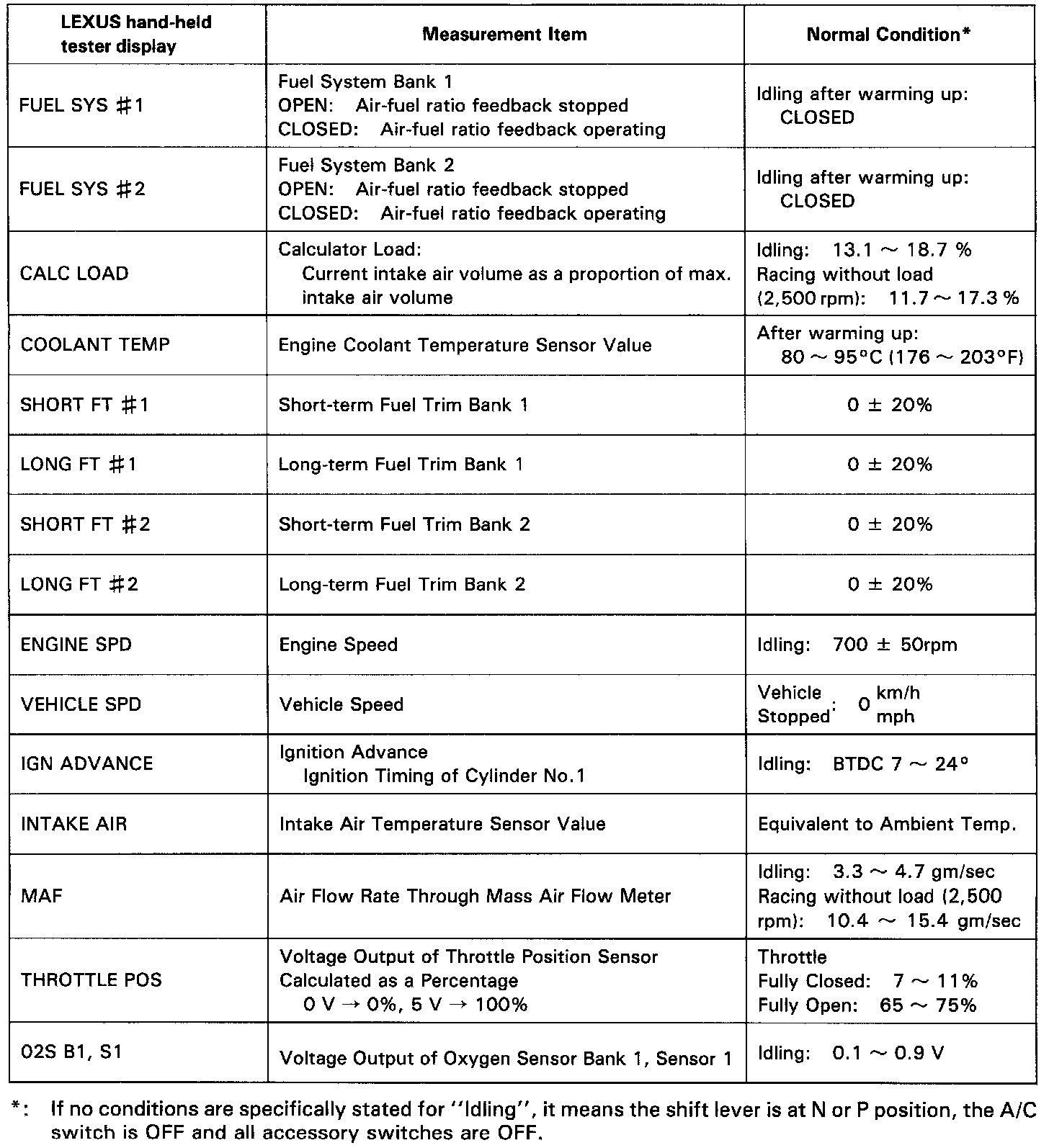 NOTICE: The values given for "Normal Condition" are representative values, so a vehicle may still be normal even if its value varies from those listed here. So do not decide whether a part is faulty or not solely according to the "Normal Condition" here.