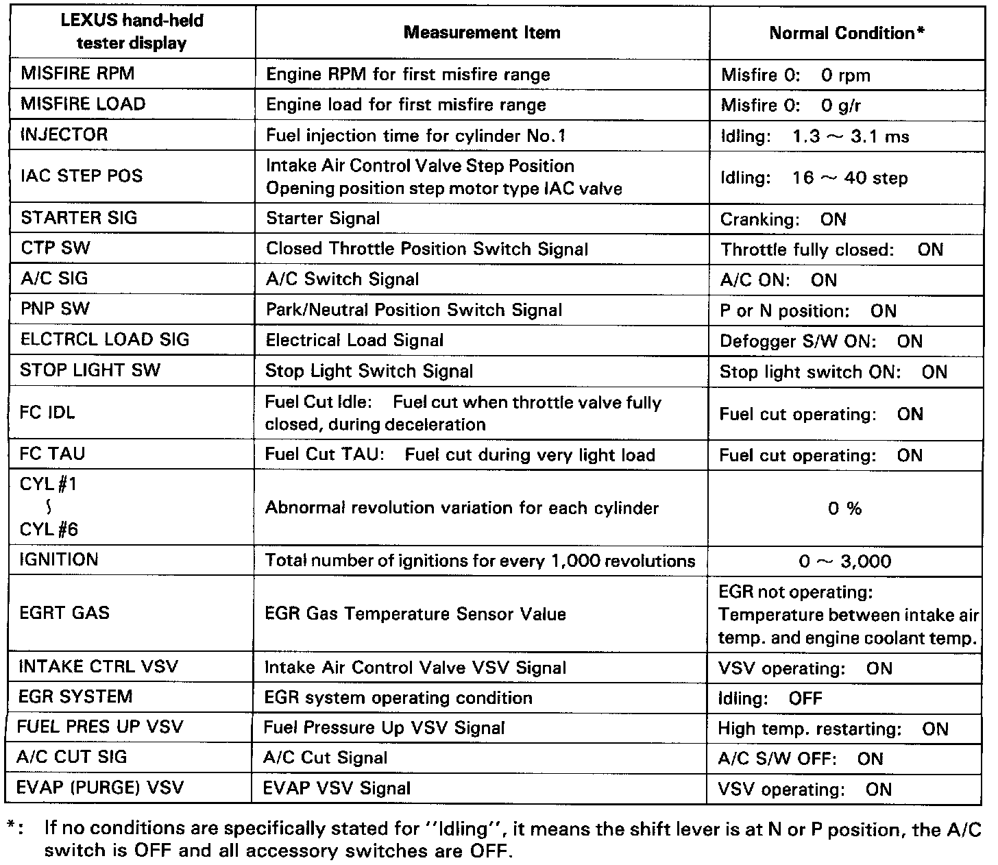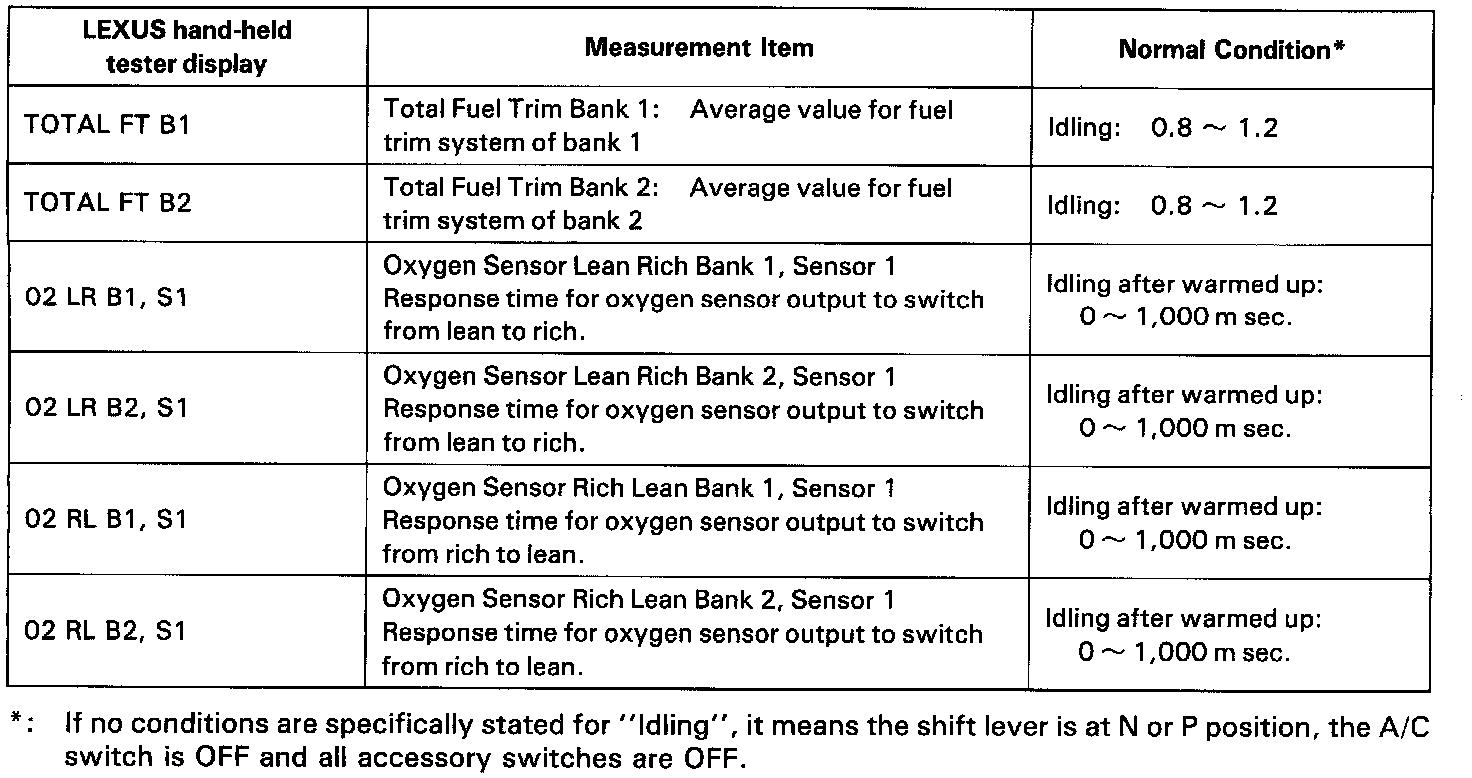 NOTICE: The values given below for "Normal Condition" are representative values, so a vehicle may still be normal even if its value varies from those listed here. So do not decide whether a part is faulty or not solely according to the "Normal Condition" here.