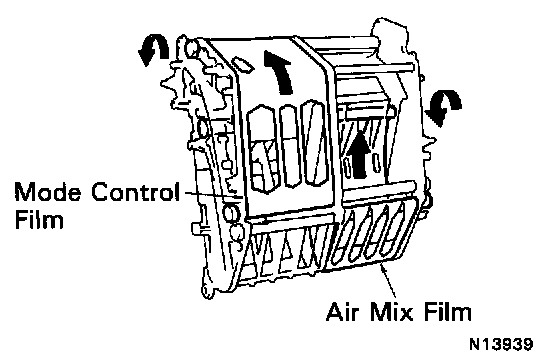After the repair is completed, initializing involves setting the air mix film and mode control film to initial position. This requires that each film is completely rewound the air mix film to the cool side, the mode control film to the FACE side.