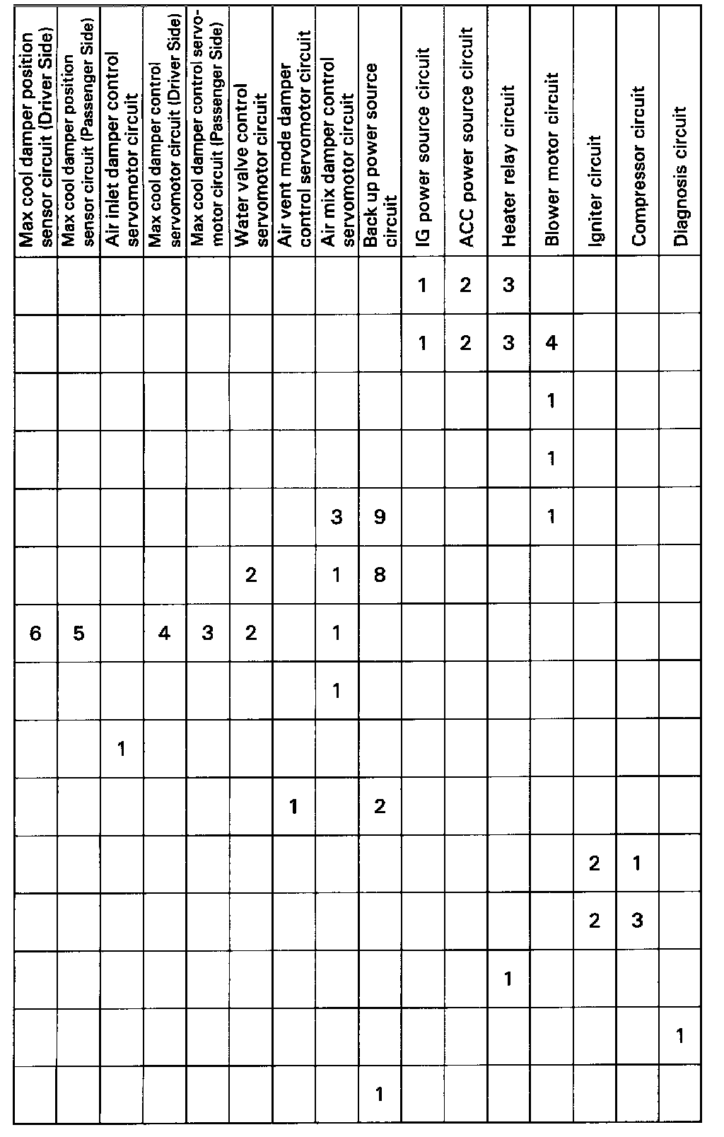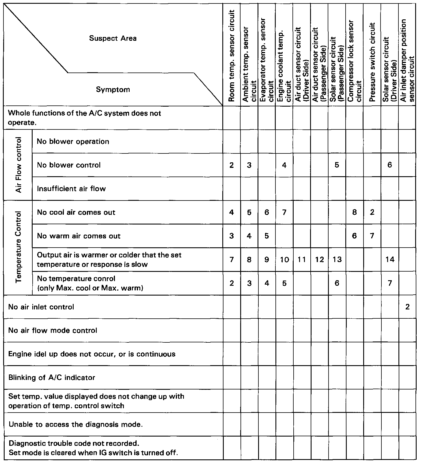 - If the trouble still reappears even though there are no abnormalities in any of the other circuits, then check or replace the air conditioning control assembly.