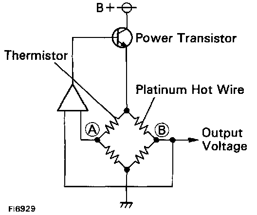 The hot wire is maintained at the set temperature by controlling the current flow through the hot wire. This current flow is then measured as the output voltage of the air flow meter.