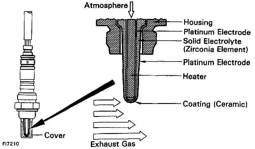 The oxygen sensor has the characteristic whereby its output voltage changes suddenly in the vicinity of the stoichiometric air/fuel ratio. This characteristic is used to detect the oxygen concentration in the exhaust gas and provide feedback to the computer for control of the air-fuel ratio.