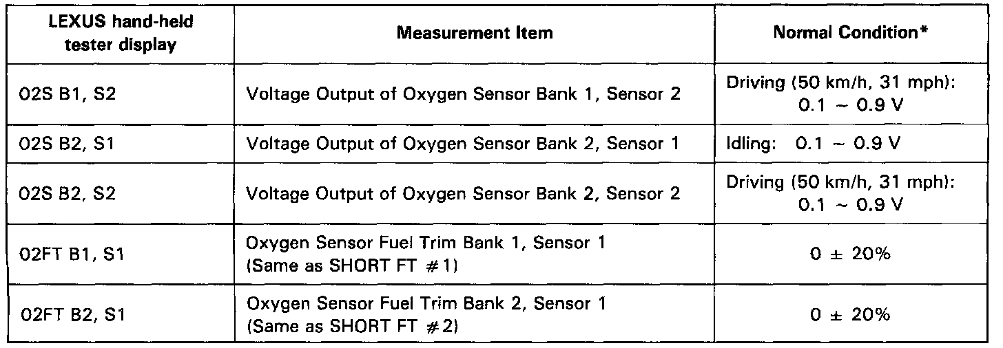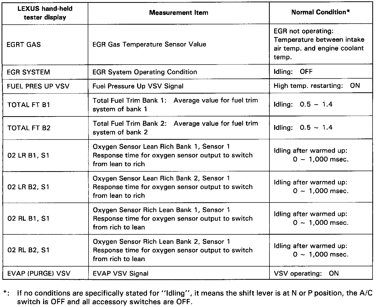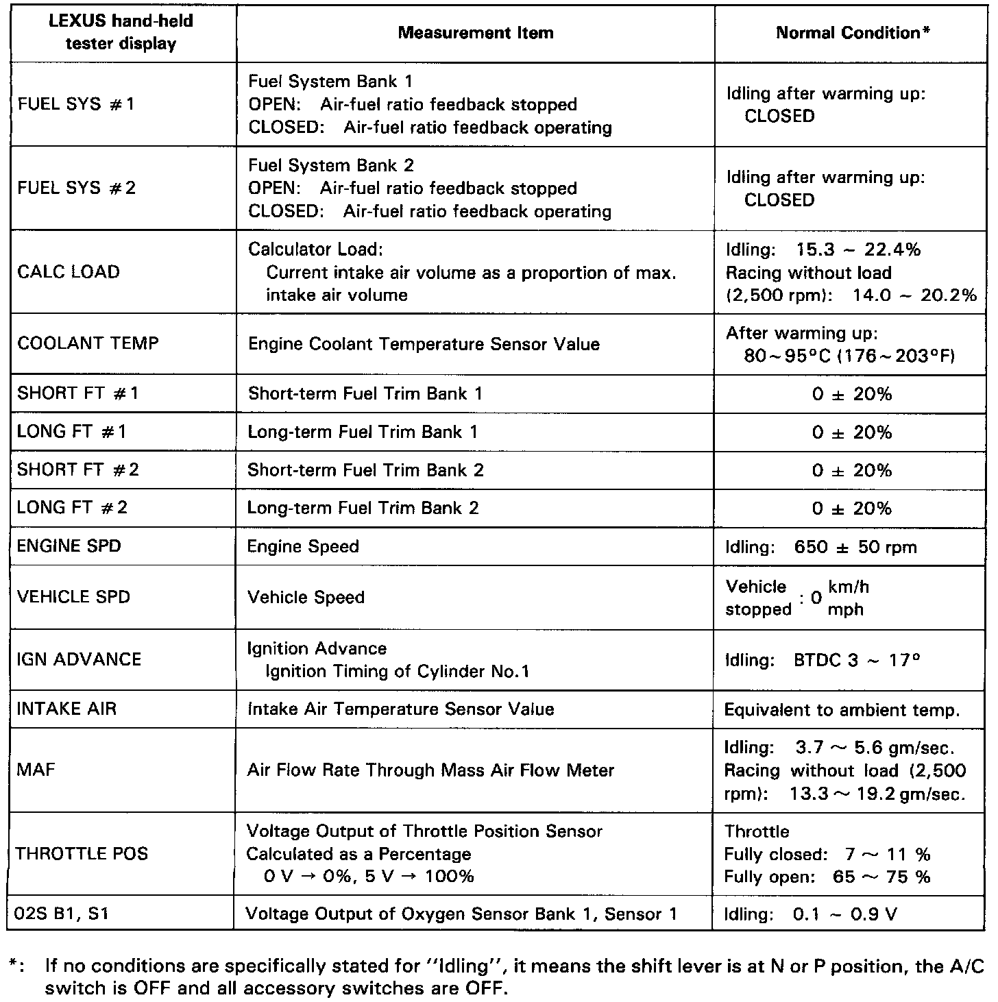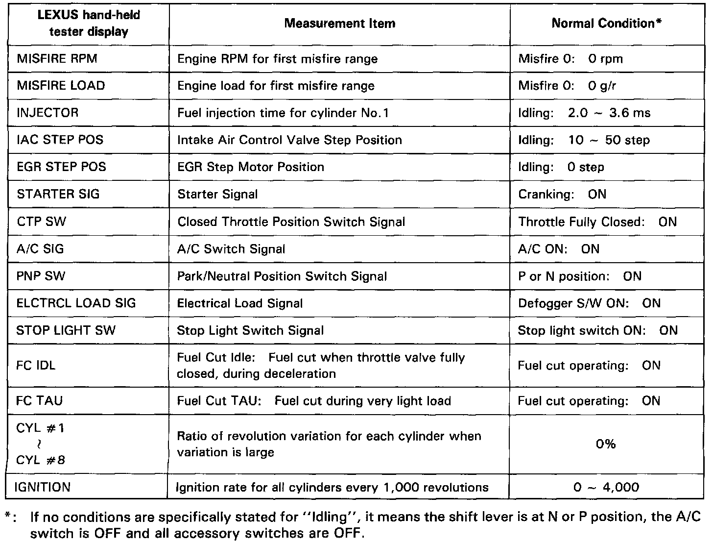 NOTICE: The values given below for "Normal Condition" are representative values, so a vehicle may still be normal even if its value varies from those listed here. So do not decide whether a part is faulty or not solely according to the "Normal Condition" here.CARB Mandated Signals