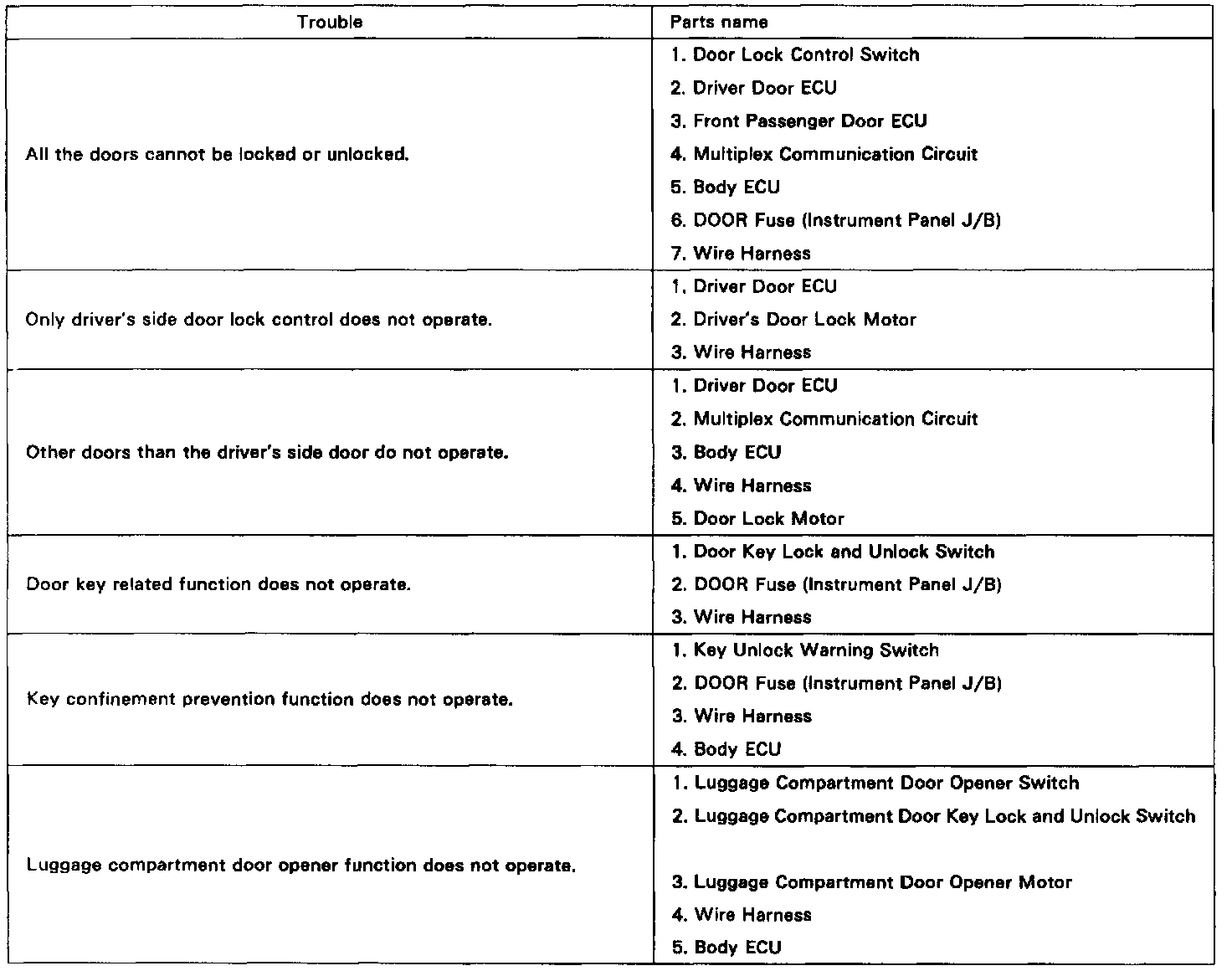 The table above will be useful for you in troubleshooting these electrical problems. The most likely causes of the malfunction are shown in the order of their probability. Inspect each part in the order shown, and replace the part when it is found to be faulty.