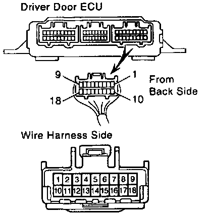 Disconnect the connector from the driver door ECU and inspect the connector on wire harness side, as shown.