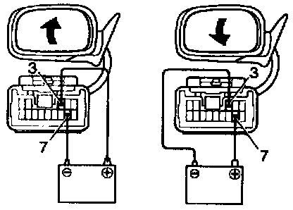 c. Connect the positive (+) lead from the battery to terminal 3 and negative (-) lead to terminal 7, then check that the mirror turns upward.