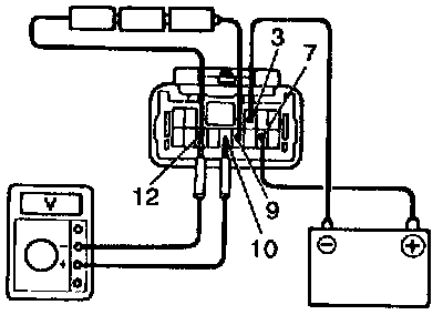 c. Connect the positive (+) lead from the voltmeter to terminal 10 and the negative (-) lead to terminal 12.