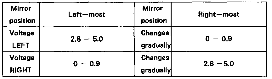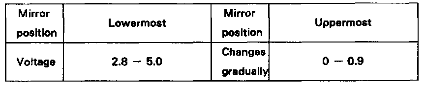 d. Apply battery positive voltage to terminals 3 and 7. then check that the voltage gradually changes according to the table below while the mirror moves between the uppermost position and lowermost position.