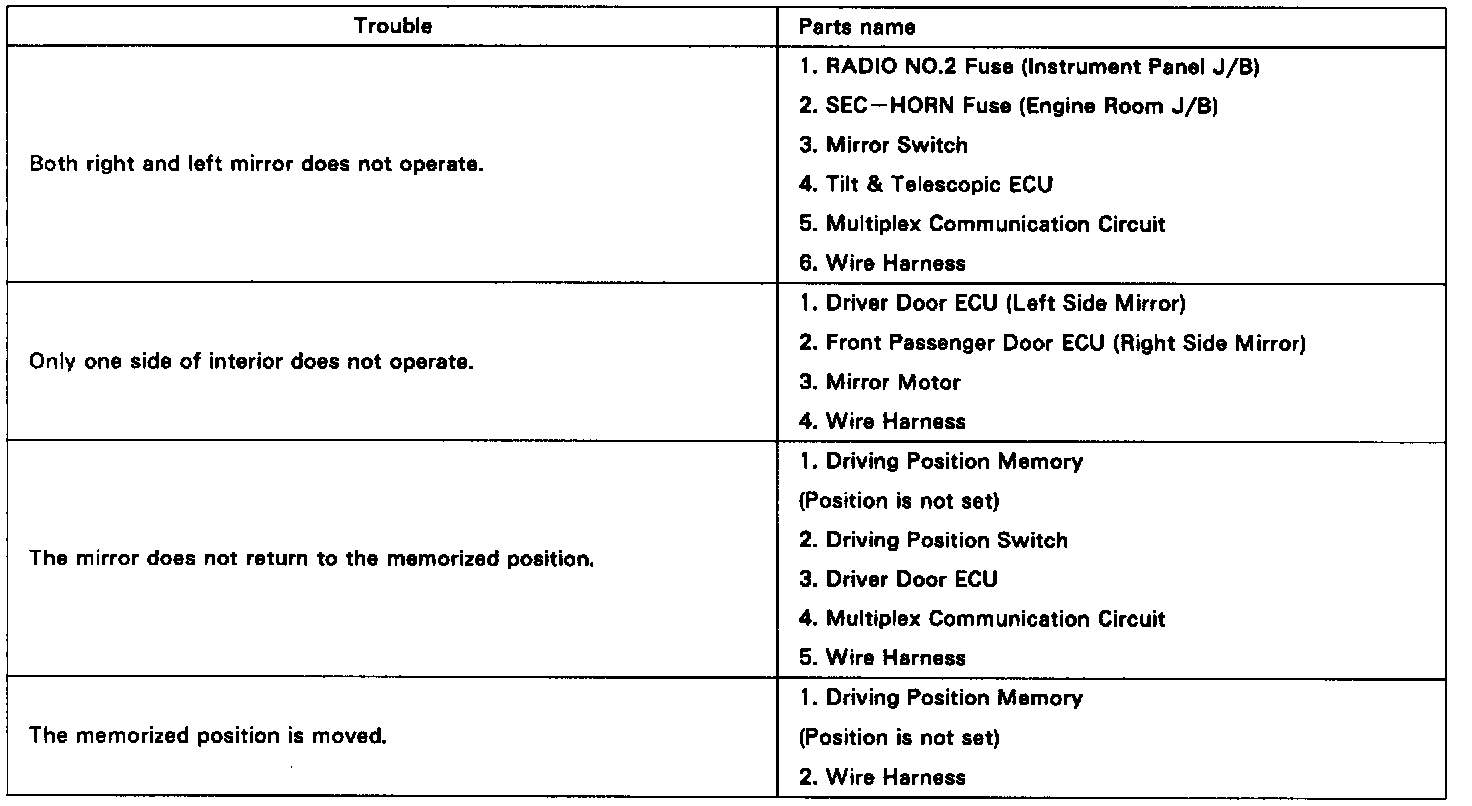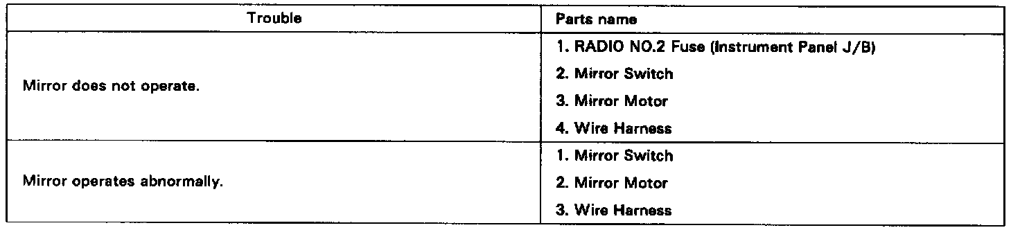 The table below will be useful for you in troubleshooting these electrical problems. The most likely causes of the malfunction are shown in the order of their probability. Inspect each part in the order shown. and replace the part when it is found to be faulty.