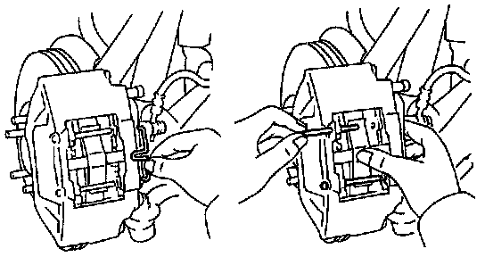 ^ If the piston is difficult to push in, loosen the bleeder plug and push in the piston while letting some brake fluid escape.