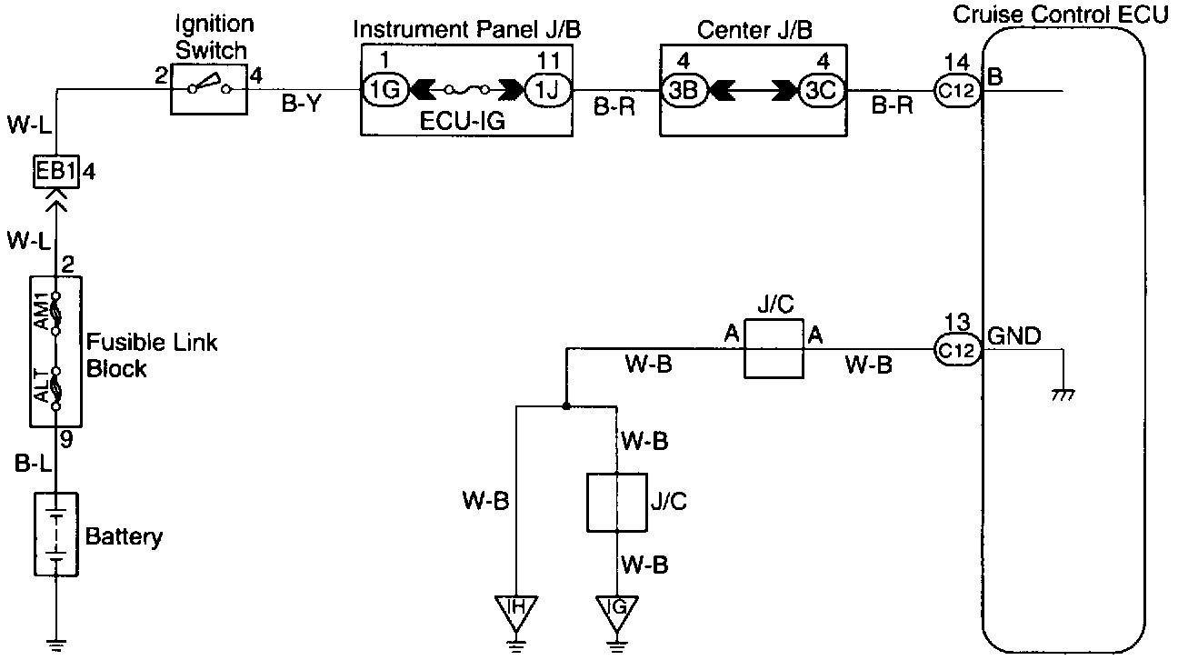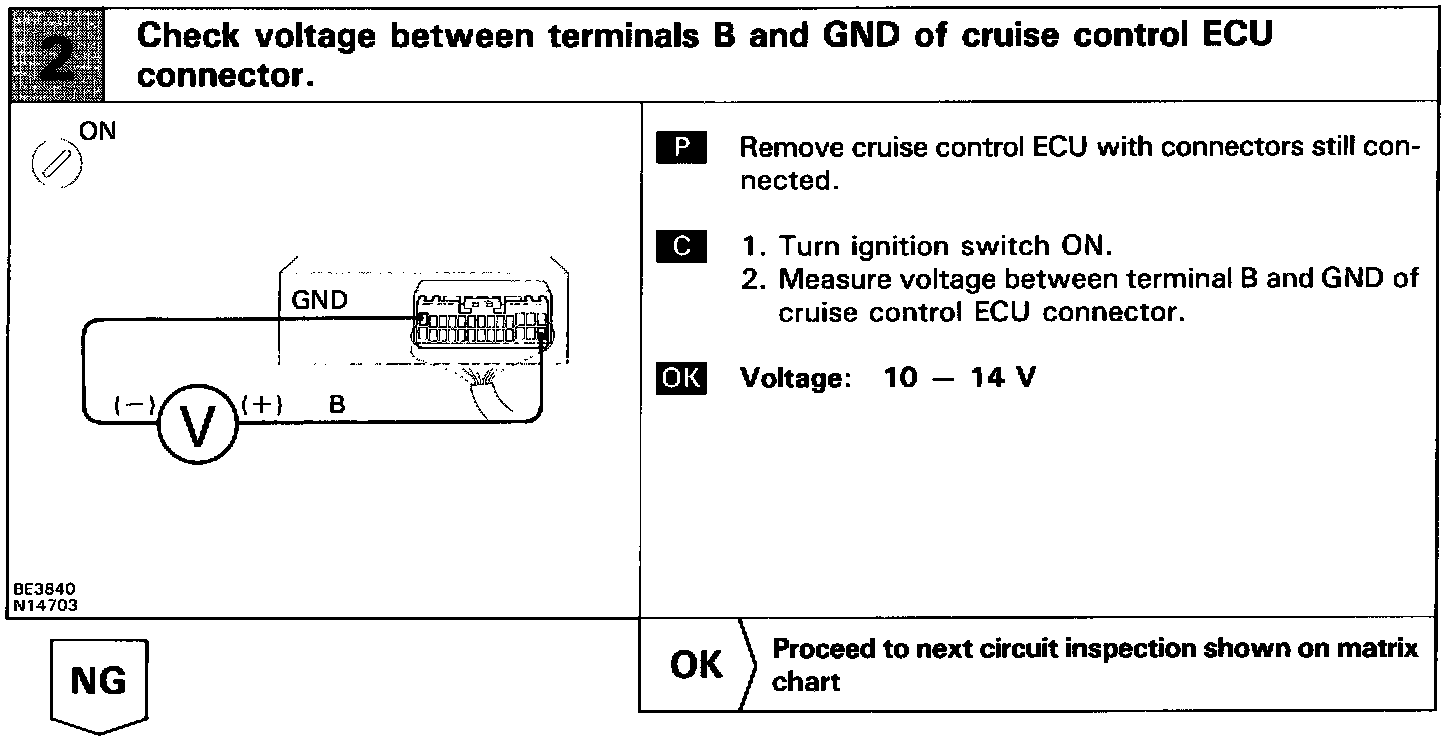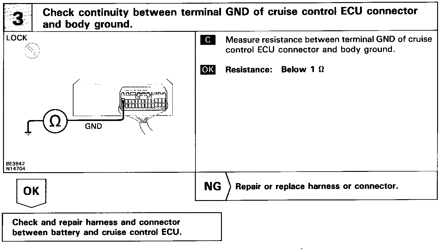 The ECU power source supplies power to the actuator and sensors, etc. When terminal GND and the cruise control ECU case are grounded.