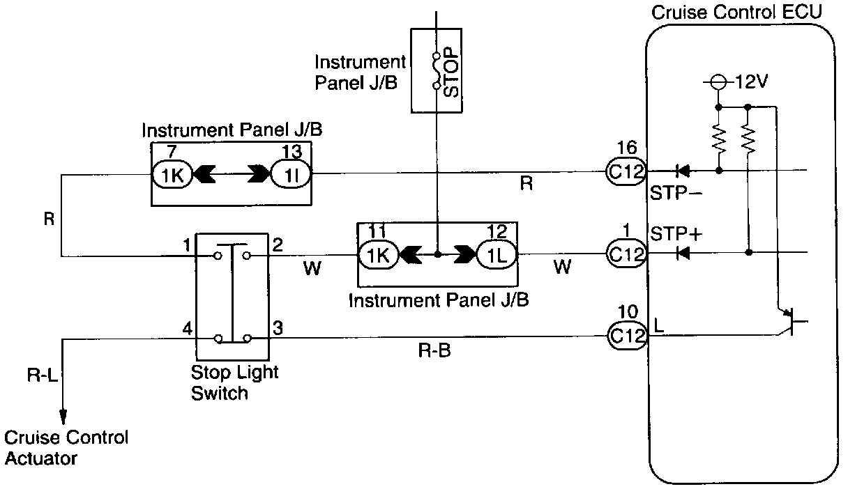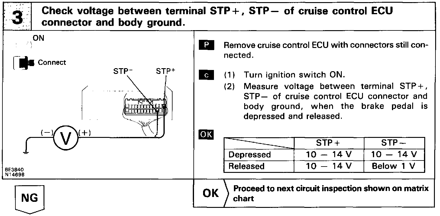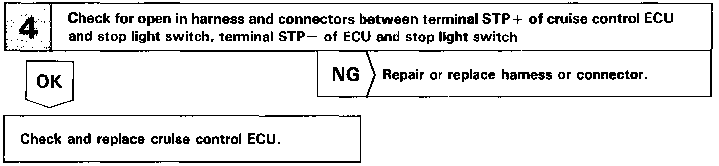 2. If the stop fuse is open, terminal STP+ becomes approx. 0 V when the brake is turned on, so the ECU performs cancel function normally.