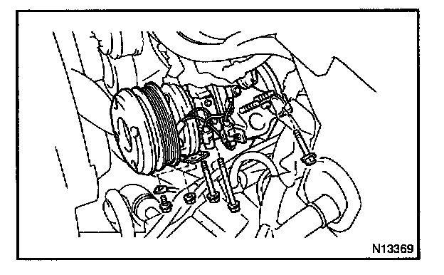 b. Remove the nut, the 3 bolts, bracket and the compressor.