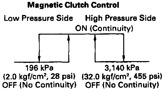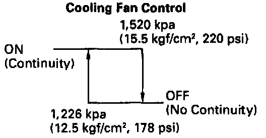 b. Check continuity between terminals when refrigerant pressure is changed, as shown in the illustration. If operation is not as specified. replace the pressure switch.
