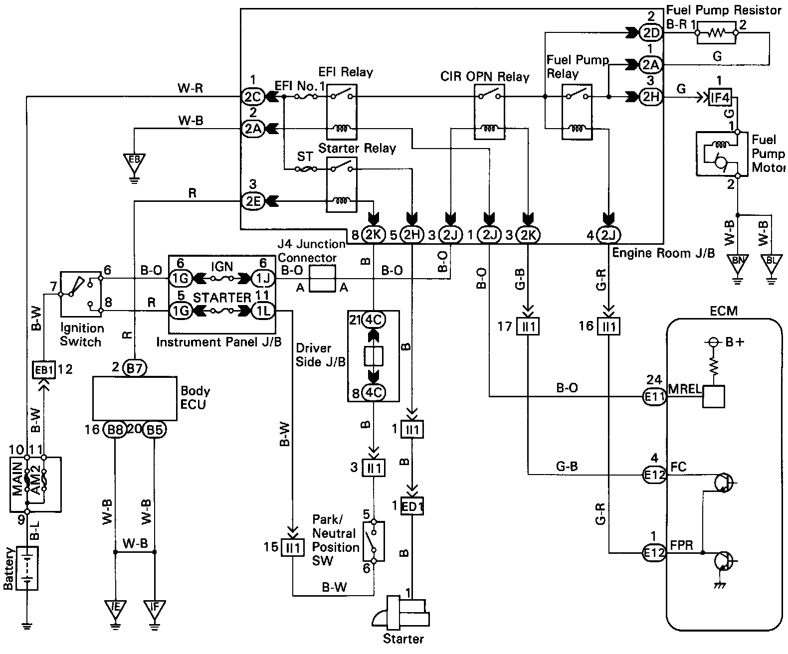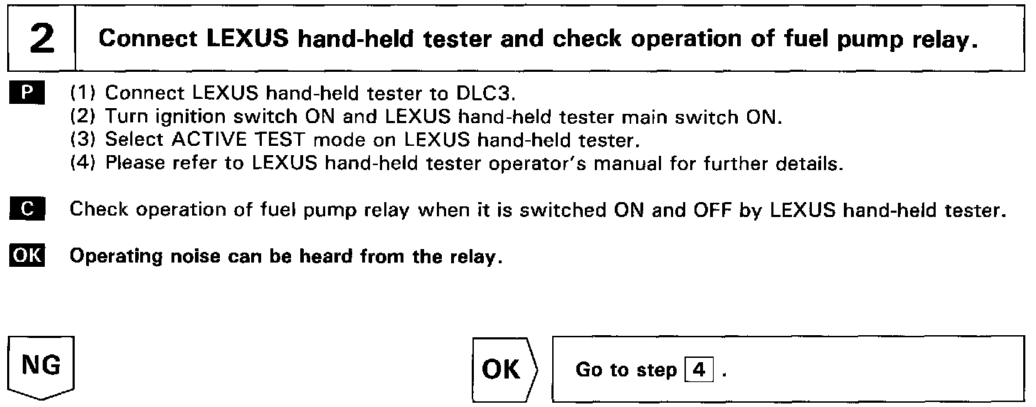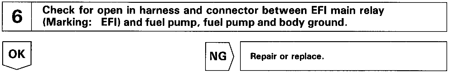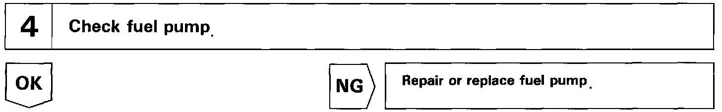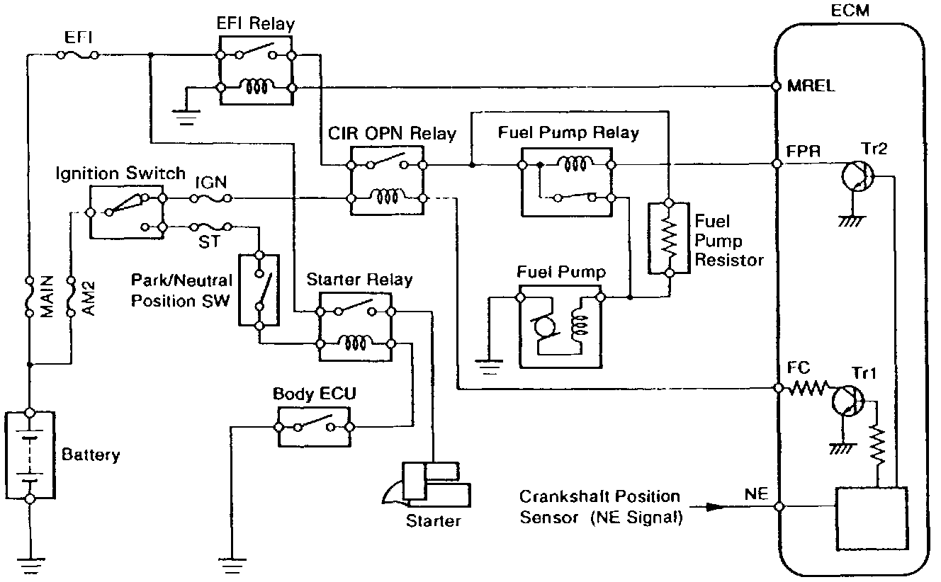 When the STA signal and NE signal are input to the ECM, Tr1 is turned ON, current flows to coil of the circuit opening relay, the relay switches on, power is supplied to the fuel pump and the fuel pump operates. While the NE signal is generated (engine running), the ECM keeps Tr1 ON (circuit opening relay ON) and the fuel pump also keeps operating.