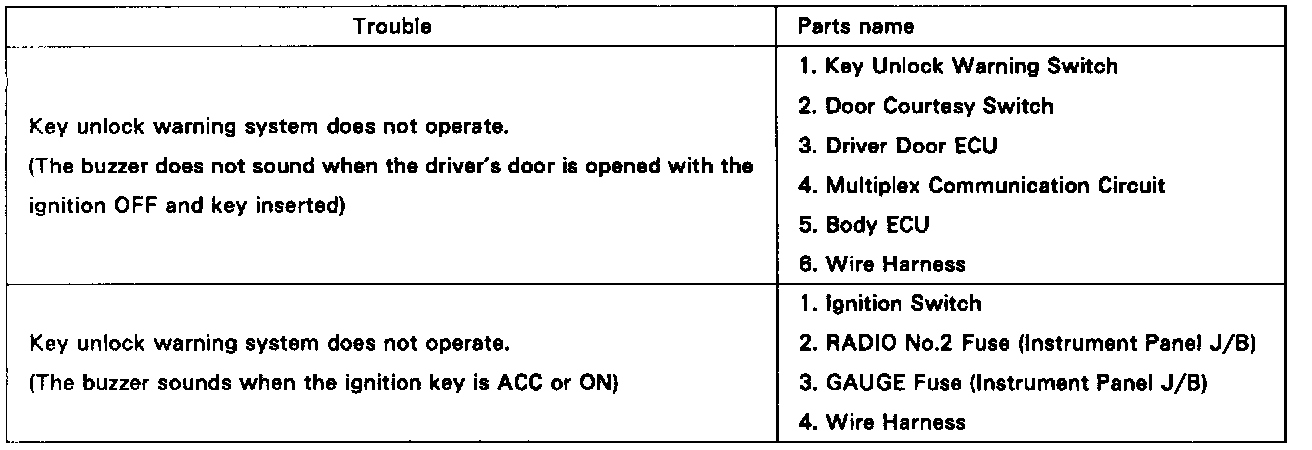 KEY UNLOCK WARNING SWITCH INSPECTION