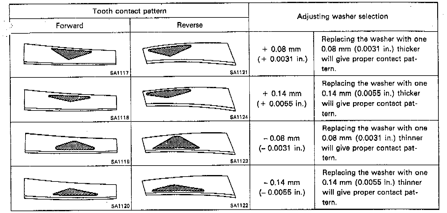 - First fit a washer with the same thickness as the washer which was removed, then After checking the tooth contact pattern, replace the washer with one of a different thickness if necessary.