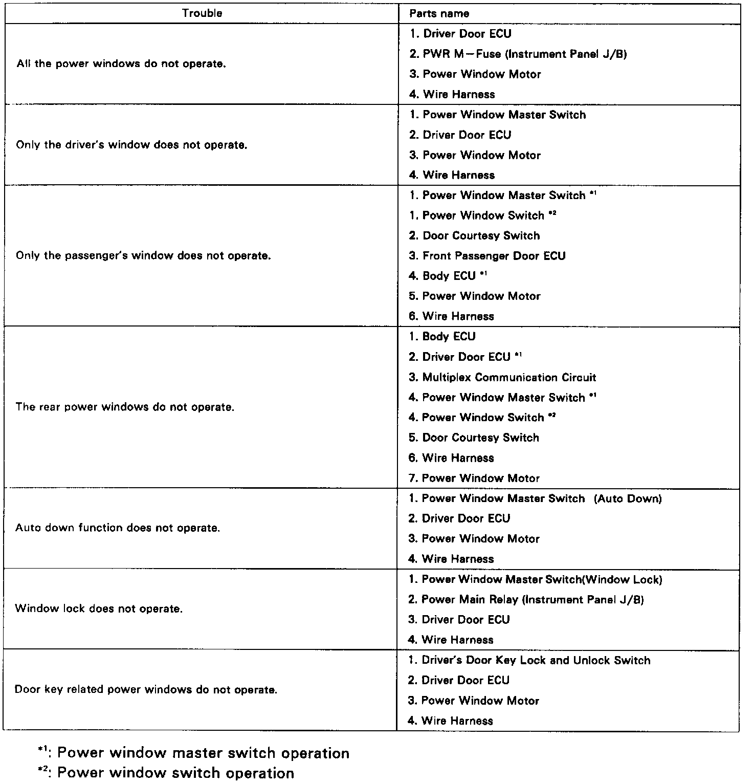 The table above will be useful for you in troubleshooting these electrical problems. The most likely causes of the malfunction are shown in the order of their probability. Inspect each part in the order shown, and replace the part when it is found to be faulty.