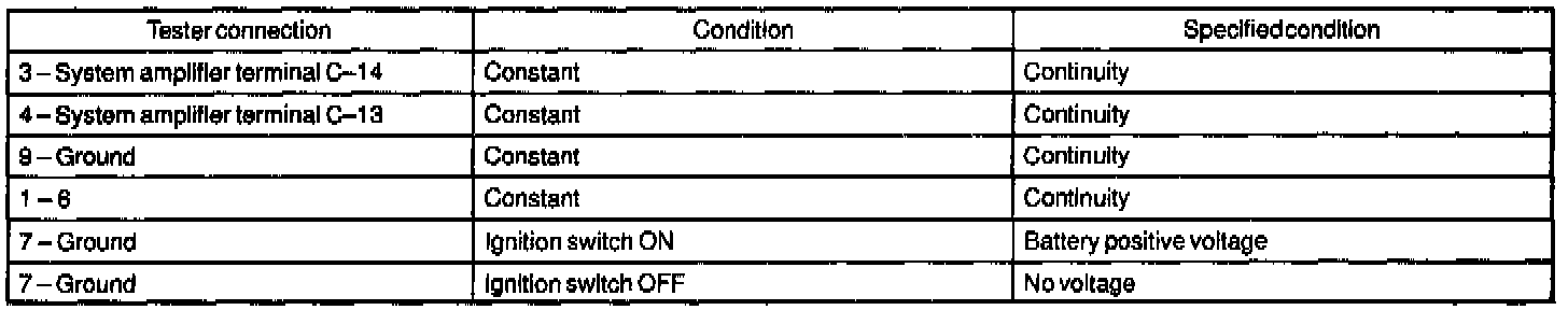 Disconnect the connector from the amplifier and inspect the connector on wire harness side, as shown in the chart below.