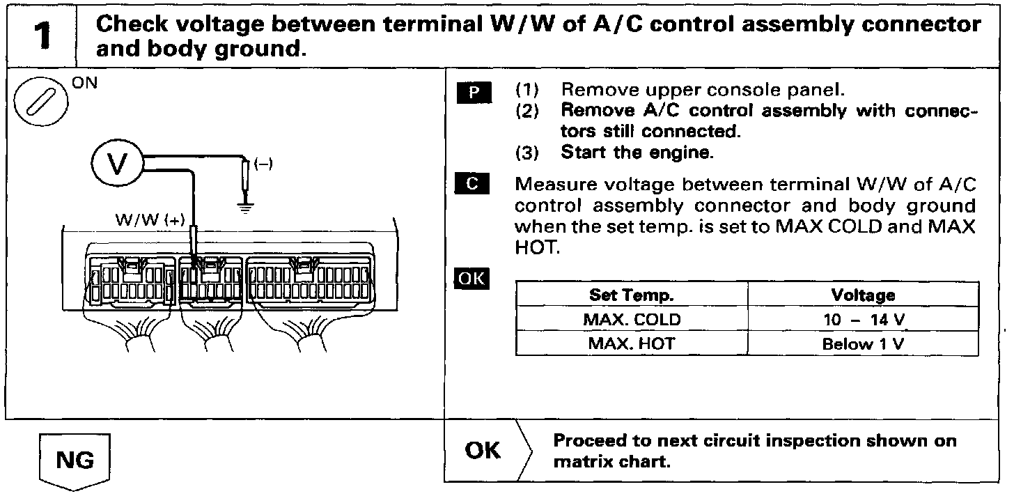 CIRCUIT DESCRIPTIONIf the target air mix damper position is on the hot side beyond a predetermined level, the A/C control assembly turns ON Tr inside the A/C control assembly.