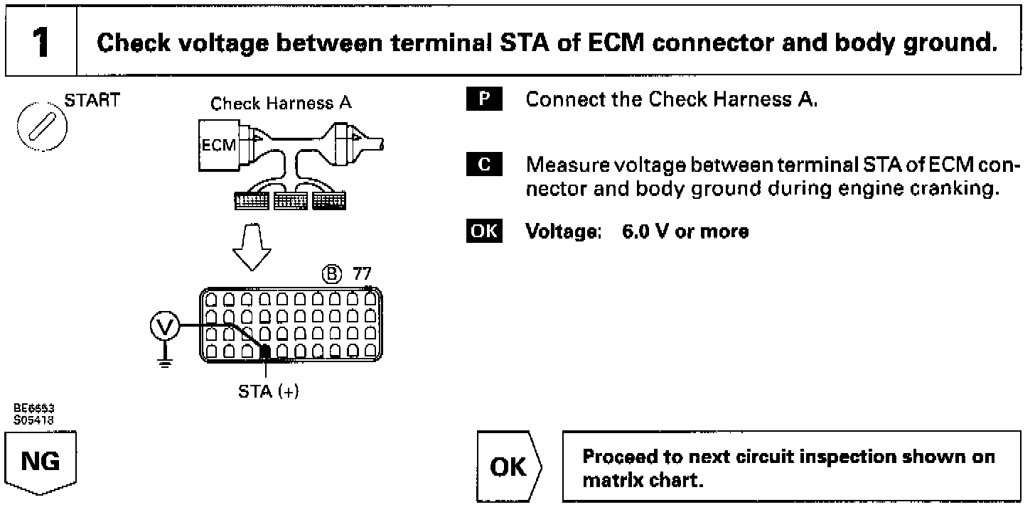 When the engine is cranked, the intake airflow is slow, so fuel vaporization is poor. A rich mixture is therefore necessary in order to active good startability. While the engine is being cranked, the battery positive voltage is applied to terminal STA of the ECM. The starter signal is mainly used to increase the fuel injection volume for the starting injection control and after-start injection control.