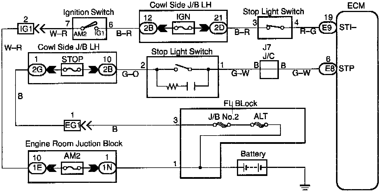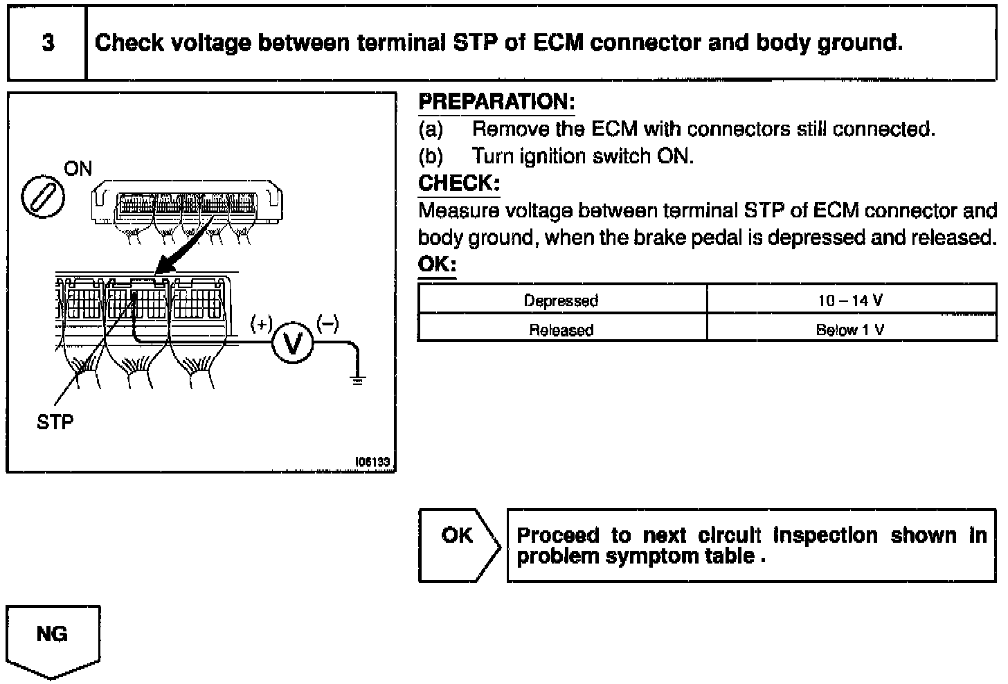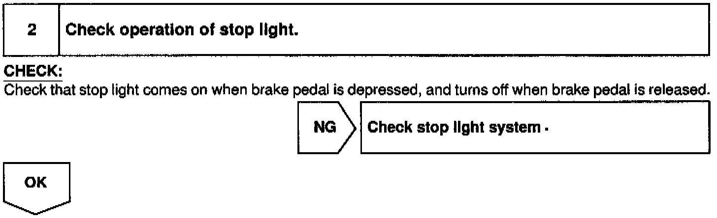 The cancel condition is that battery positive voltage is supplied to terminal STR When the brake is on, battery positive voltage is normally applied through the STOP fuse and stop light switch to terminal STP of the ECM and the ECM turns the cruise control OFF.