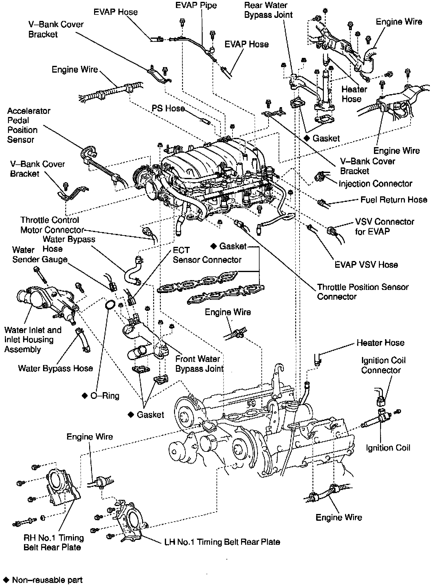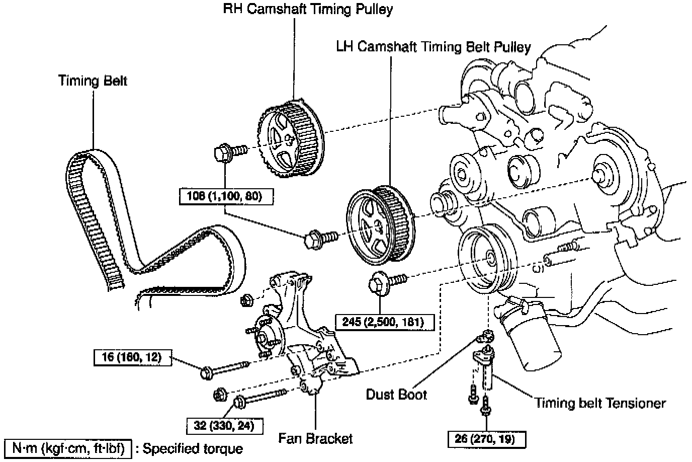 TIMING BELT TENSIONER, RIGHT AND LEFT CAMSHAFT TIMING BELT PULLEYS