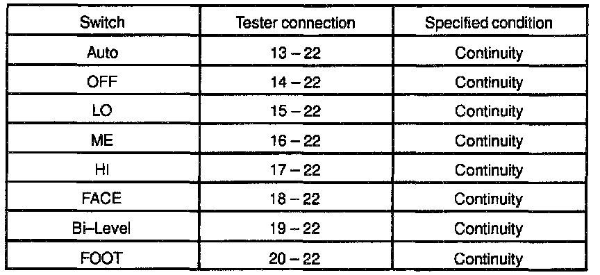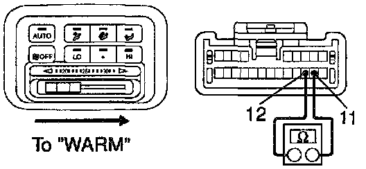 b. Gradually move the temperature control lever from "COOL" side to "WARM" side then check that the resistance between terminals 11 and 12 increase from 0 to 3.0 K Ohms.