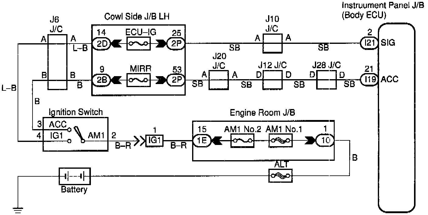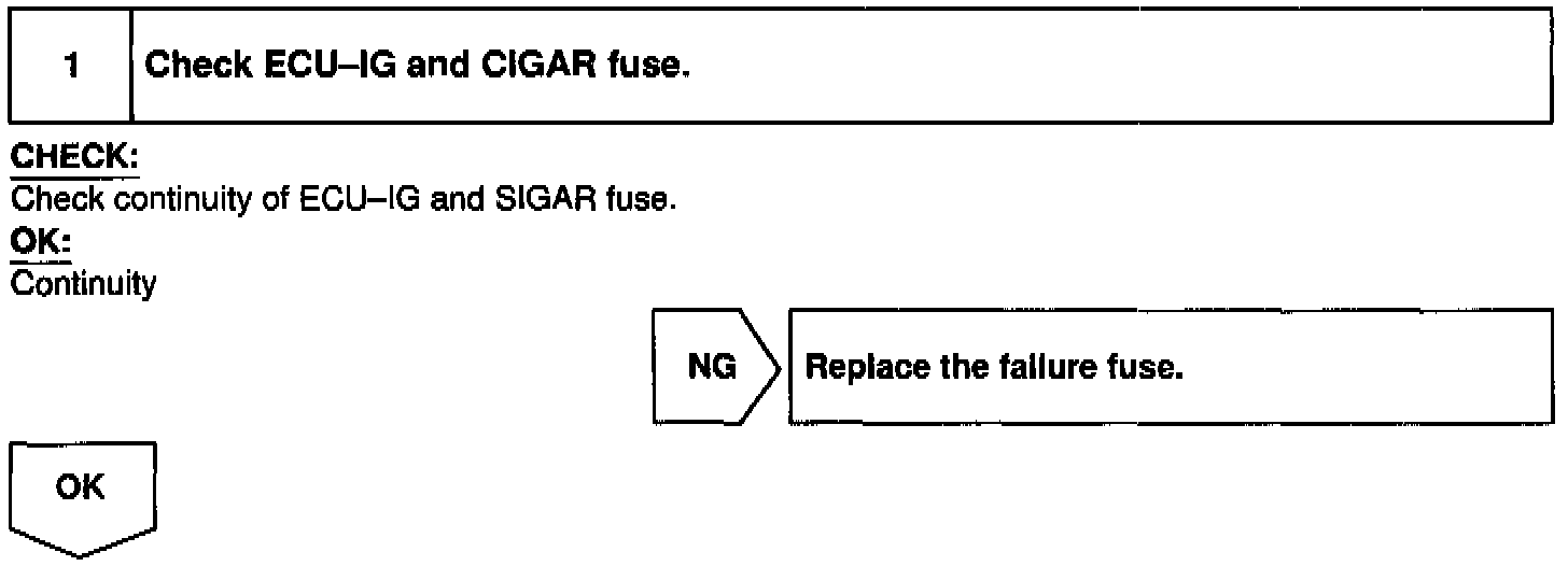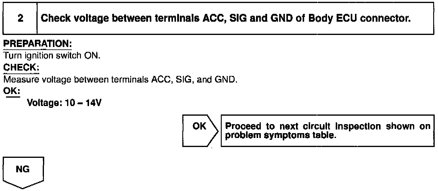When the ignition switch is turned to the ACC position, battery positive voltage is applied to the terminal ACC of the ECU and when the ignition switch is turned to the ON position, battery positive voltage is applied to the terminal SIG of the ECU.