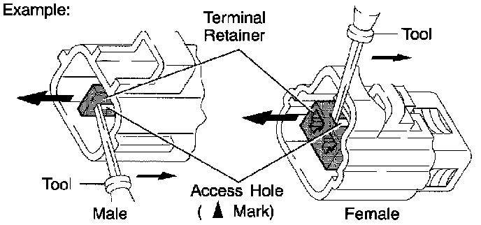 Insert the special tool into the terminal retainer access hole (~Mark) and pull the terminal retainer up to the temporary lock position.