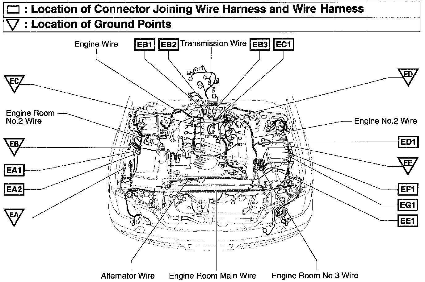 Location Of Connector Joining Wire Harness And Wire Harness Ground Points (Fig 44):