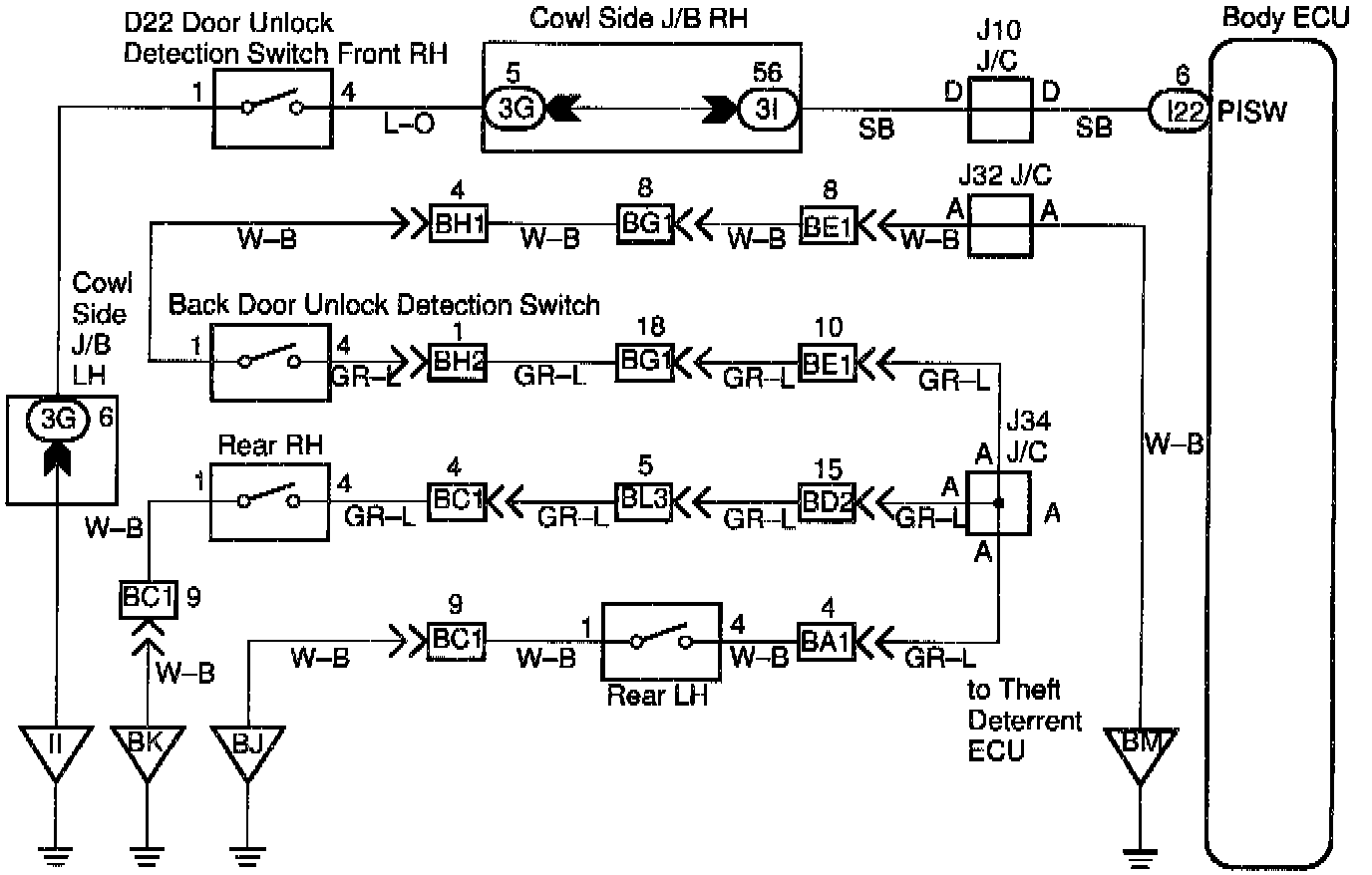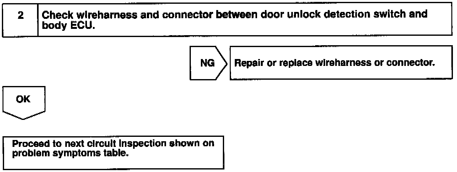 The door unlock detection switch is built in the door lock motor assembly. This Switch is ON when the door lock knob is in the unlock position and OFF when the lock knob is in the lock position. The ECU detects the door lock knob conditions is this circuit. It is used as one of the operating conditions for the key confinement prevention function.