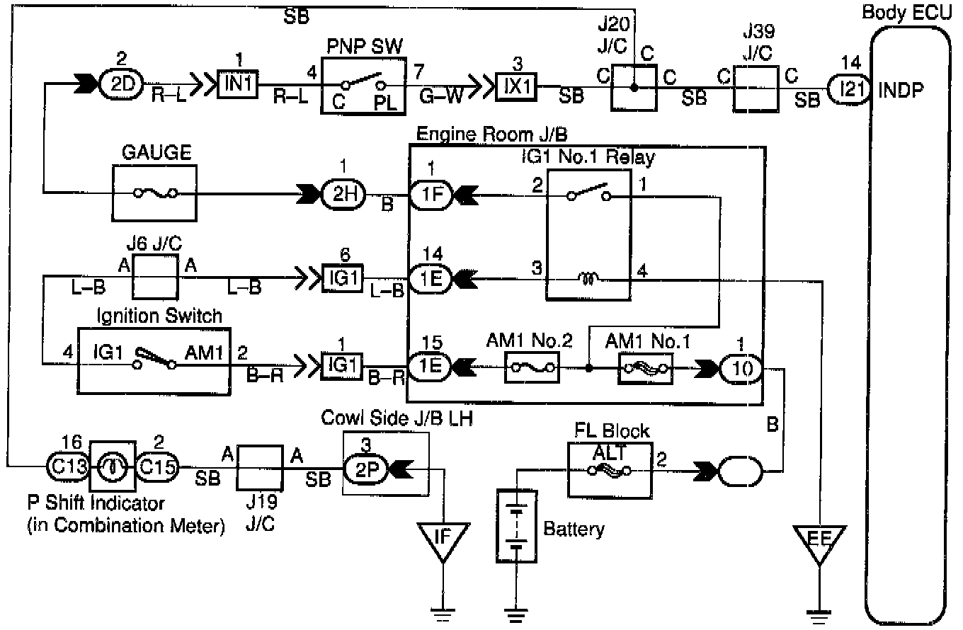 The park/neutral position switch detects the shift lever position P and sends signals to the Body ECU.