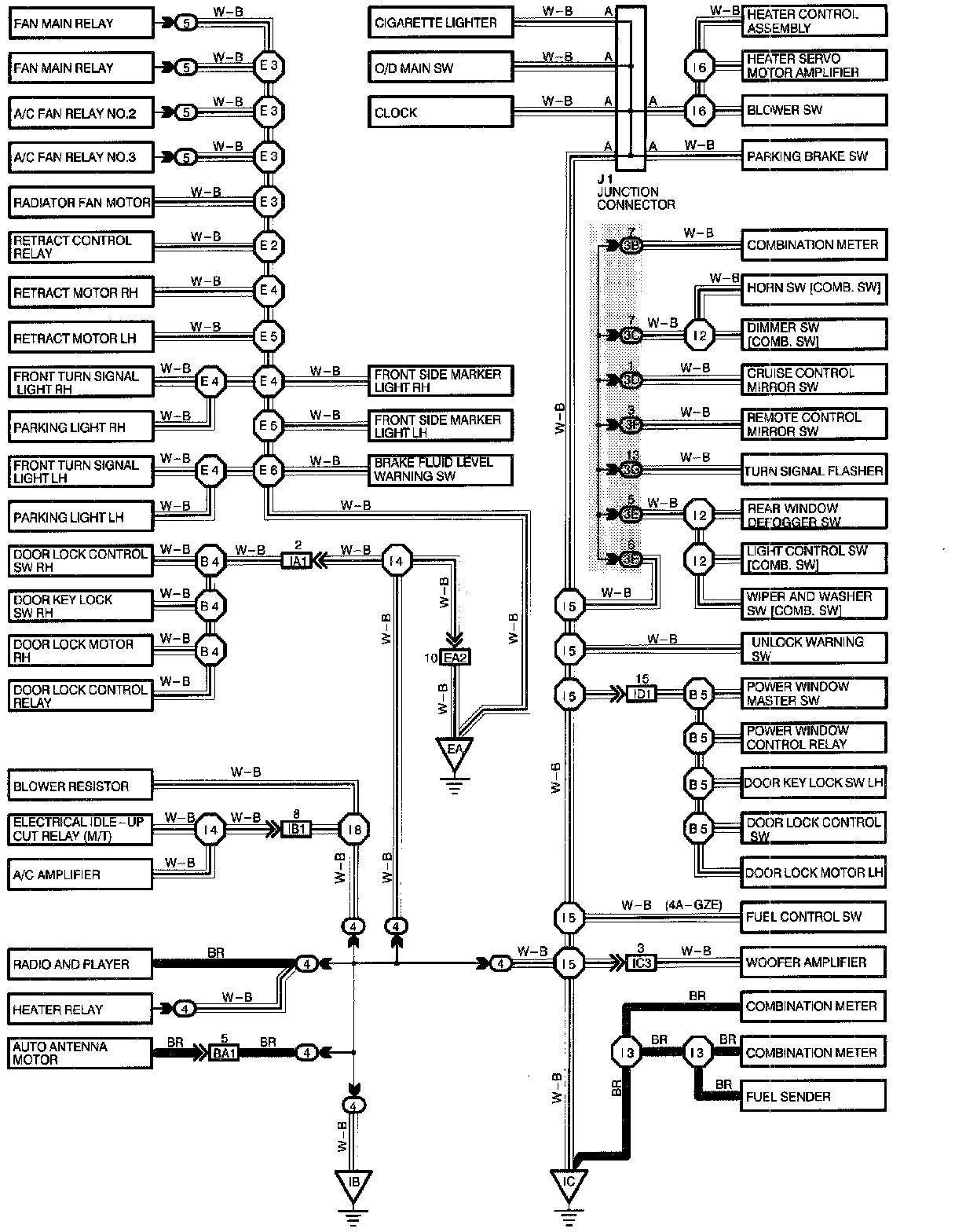 The ground points circuit diagram shows the connections from all major parts to the respective ground points. When troubleshooting a faulty ground point, checking the system circuits which use a common ground may help you identify the problem ground quickly. The relationship between ground points (EA, IB and IC shown below) can also be checked this way.