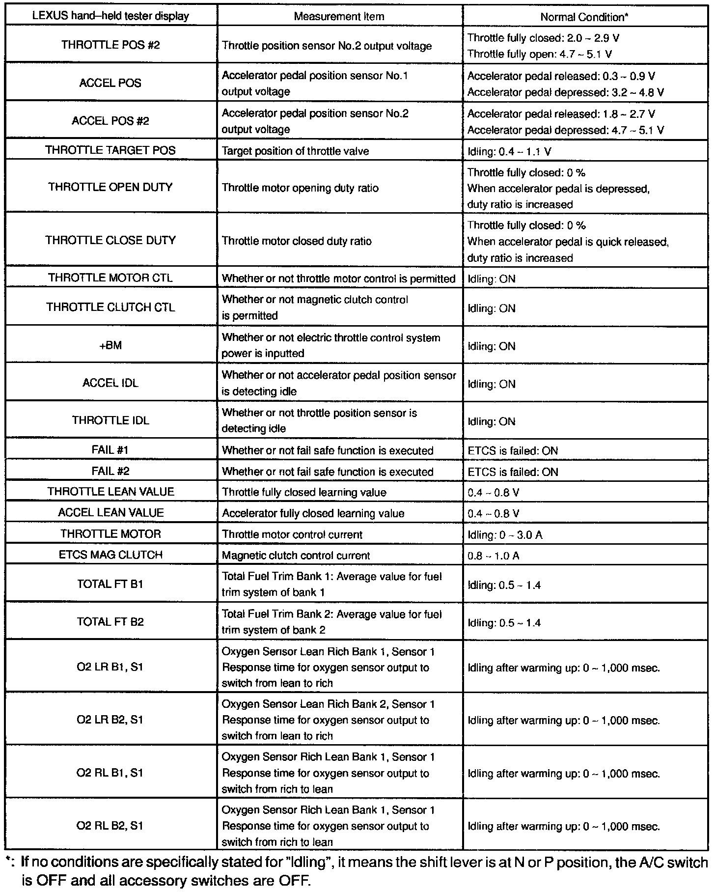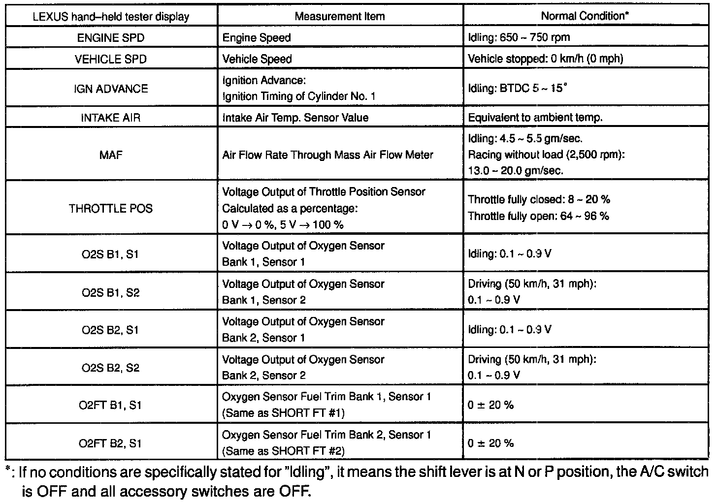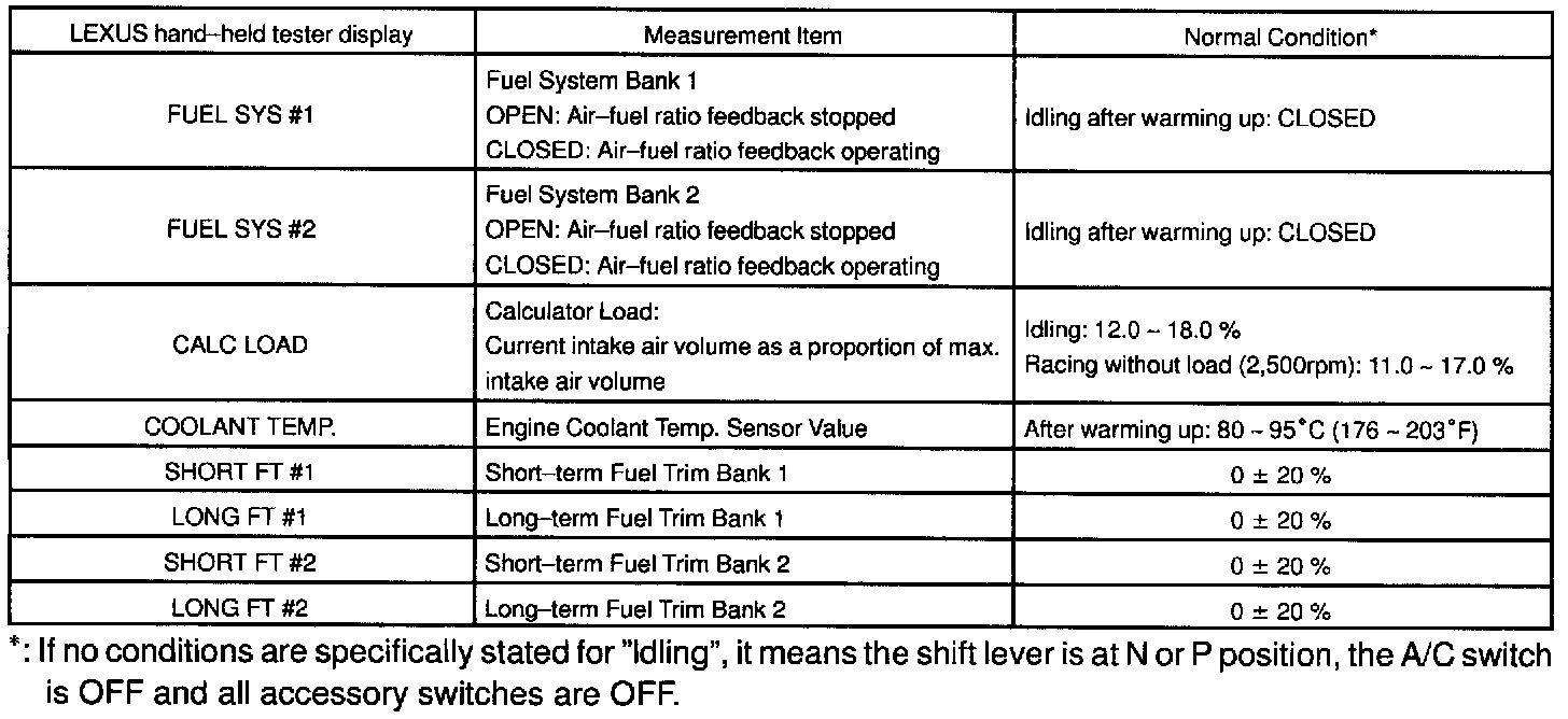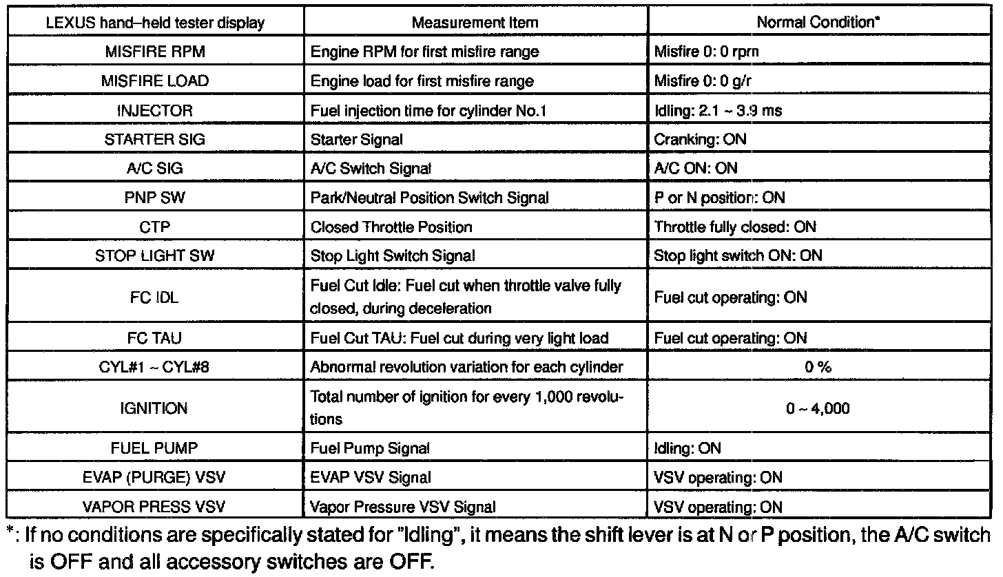 NOTICE: The values given below for "Normal Condition" are representative values, so a vehicle may still be normal even if its value varies from those listed here. So do not decide whether a part is faulty or not solely according to the "Normal Condition" here.