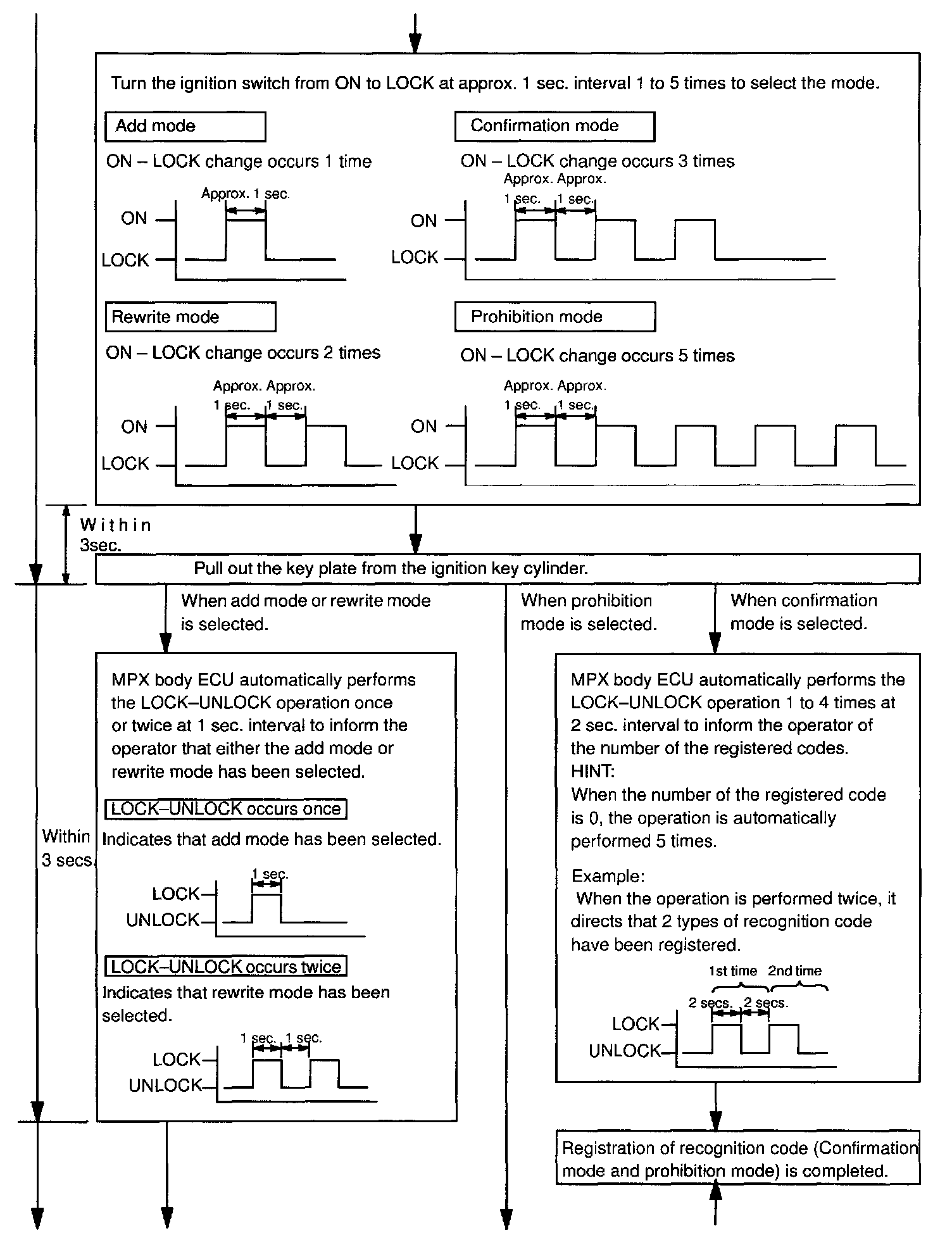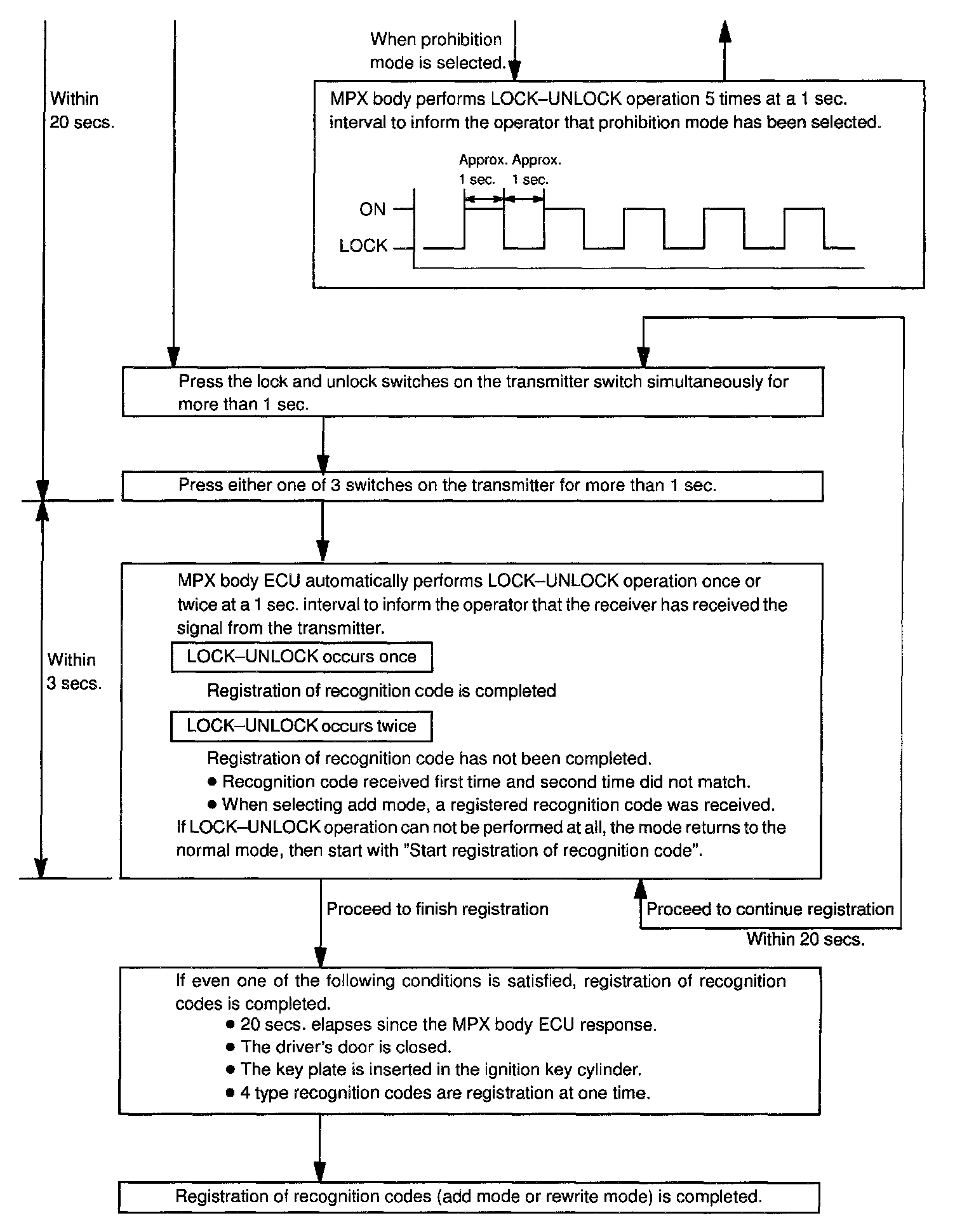 - The add mode is used to retain codes already registered while you register new recognition codes. This mode is used when adding a transmitter. However, if the number of registered codes exceeds 4 codes, previously registered codes are correspondingly erased in order, starting from the first registered code.